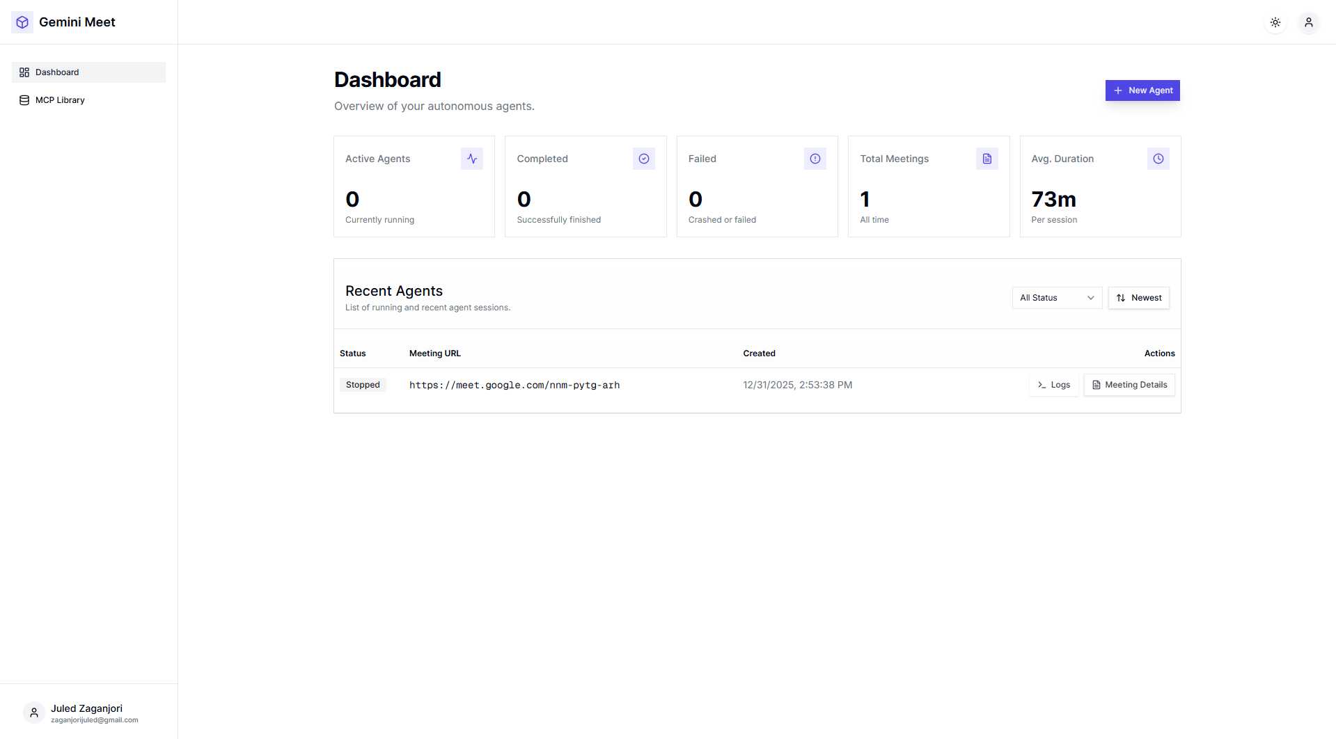 Open http://localhost:3000, click "New Agent", and paste your Google Meet or Zoom link.