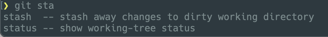 When I use the git command, git supports auto complete. For example, I typed git sta and pressed tab then git showed suggestions. I can select one of suggestions with arrow keys (up/down) and tab and enter.