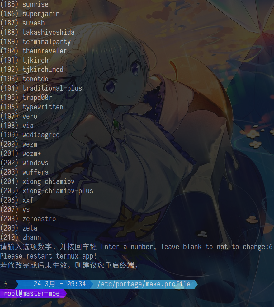 此模式为交互式操作,您可以先输zshtheme启动,接着输入数字序号。