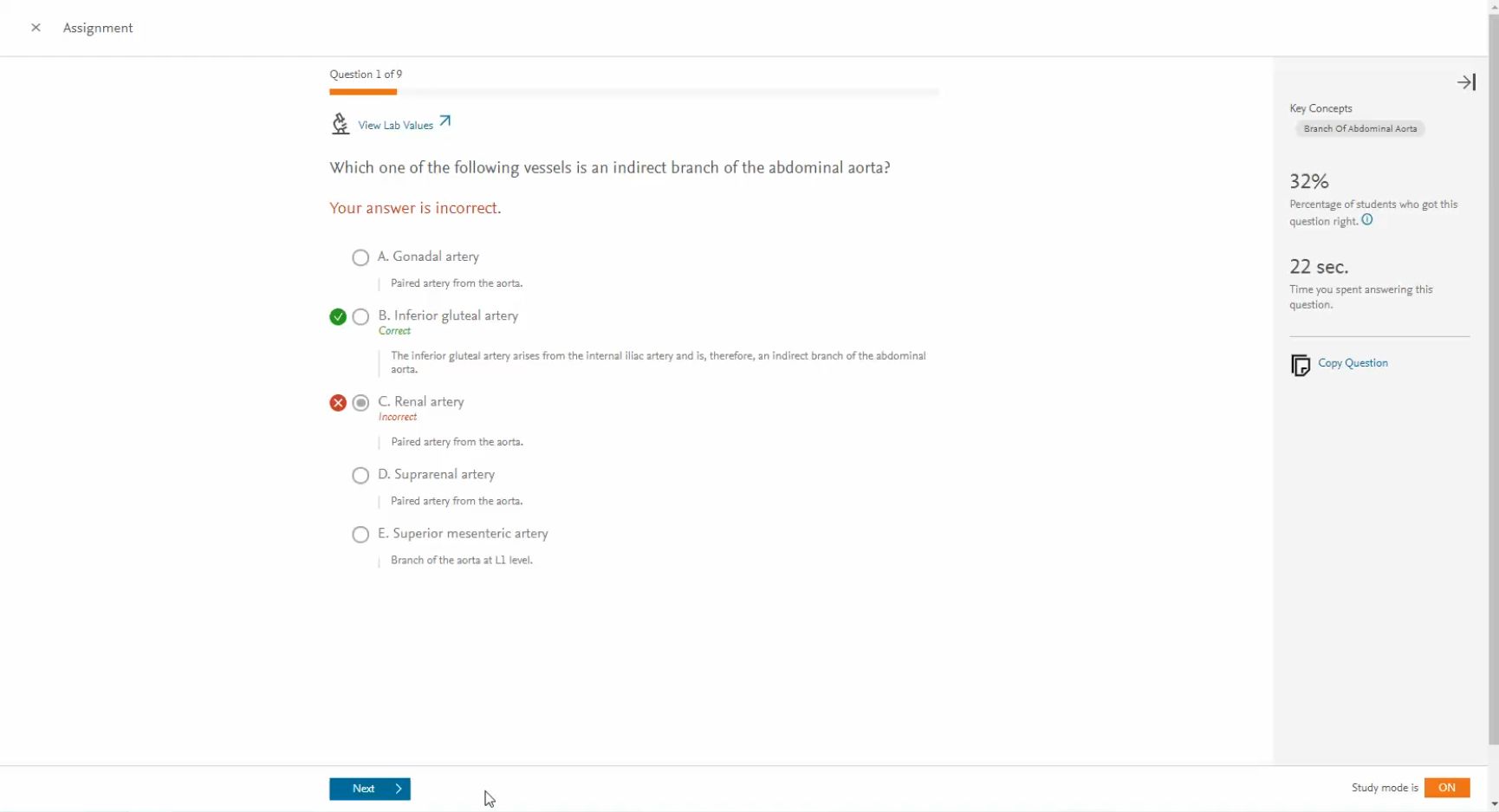 A next button is available to start the next question.