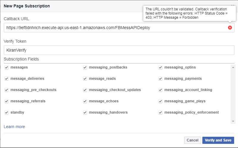 I have followed the steps you have listed, in the webhooks section i am getting an error " The URL couldn't be validated. Callback verification failed with the following errors: HTTP Status Code = 403; HTTP Message = Forbidden" ,