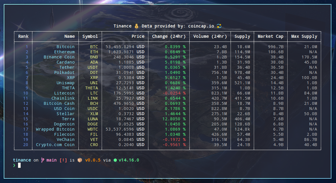 --topor-t: Get topxcryptocurrencies. Default:20$ tinance --top 30 # Get top 30--convertor-c: Convert price to preferred currency. Default:USD$ tinance --currency EUR # Convert to your prefered currency like 'EUR' or 'CAD'--filteror-f: Filter by preferred cryptocurrency.$ tinance --filter bitcoin ethereum # Filter by your favorite cryptocurrency. It will convert to USD by default.--refresh: Enable auto refresh. (Every 10 seconds)