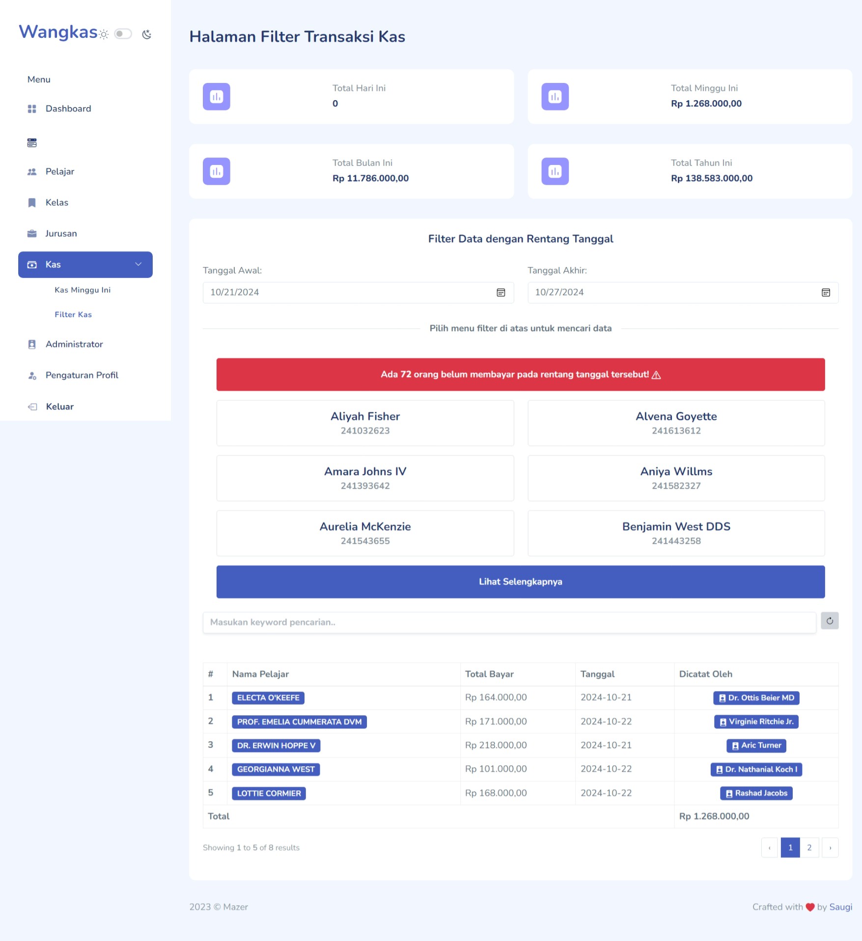 Wangkas adalah aplikasi pendataan uang kas yang dibuat menggunakan Framework Laravel 11 dan Fullstack Framework Livewire 3. Aplikasi ini dirancang untuk sistem pembayaran kas yang dilakukan satu kali setiap minggu, dan sangat cocok digunakan di lingkungan sekolah atau untuk masing-masing kelas.
