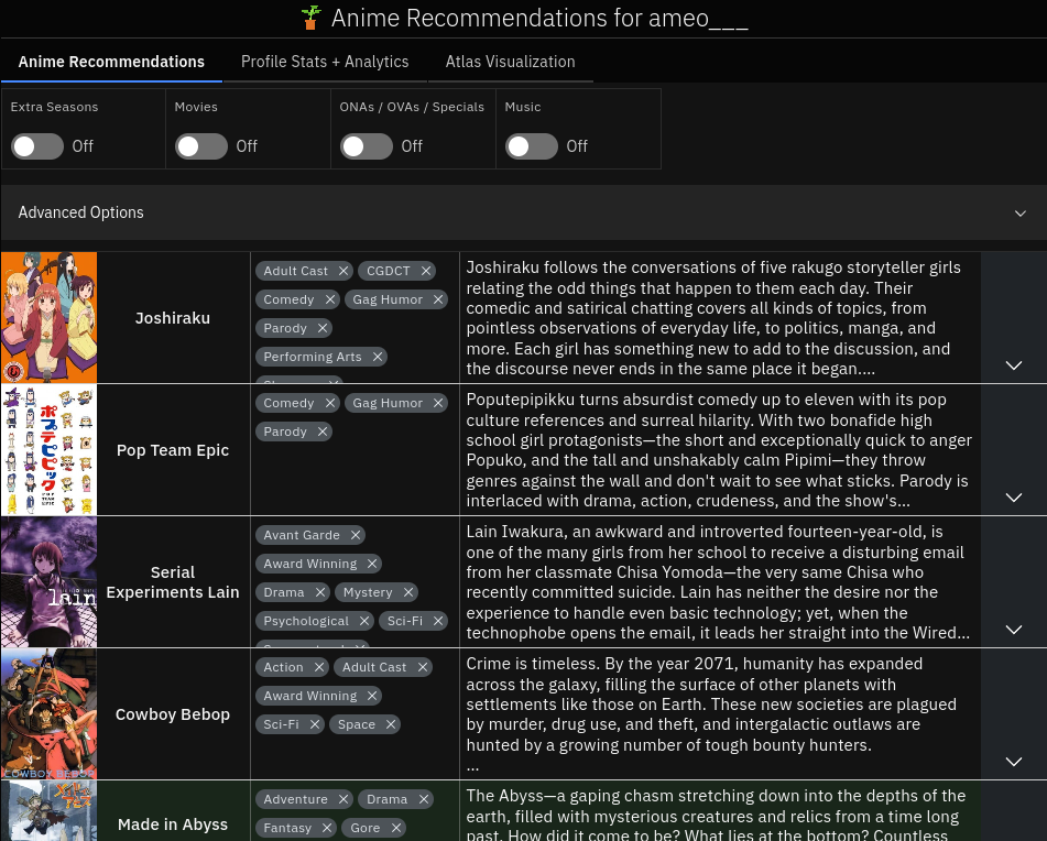 In addition to recommendations, it also has some profile analytics and an interactive visualzation of the whole world of anime, Anime Atlas: