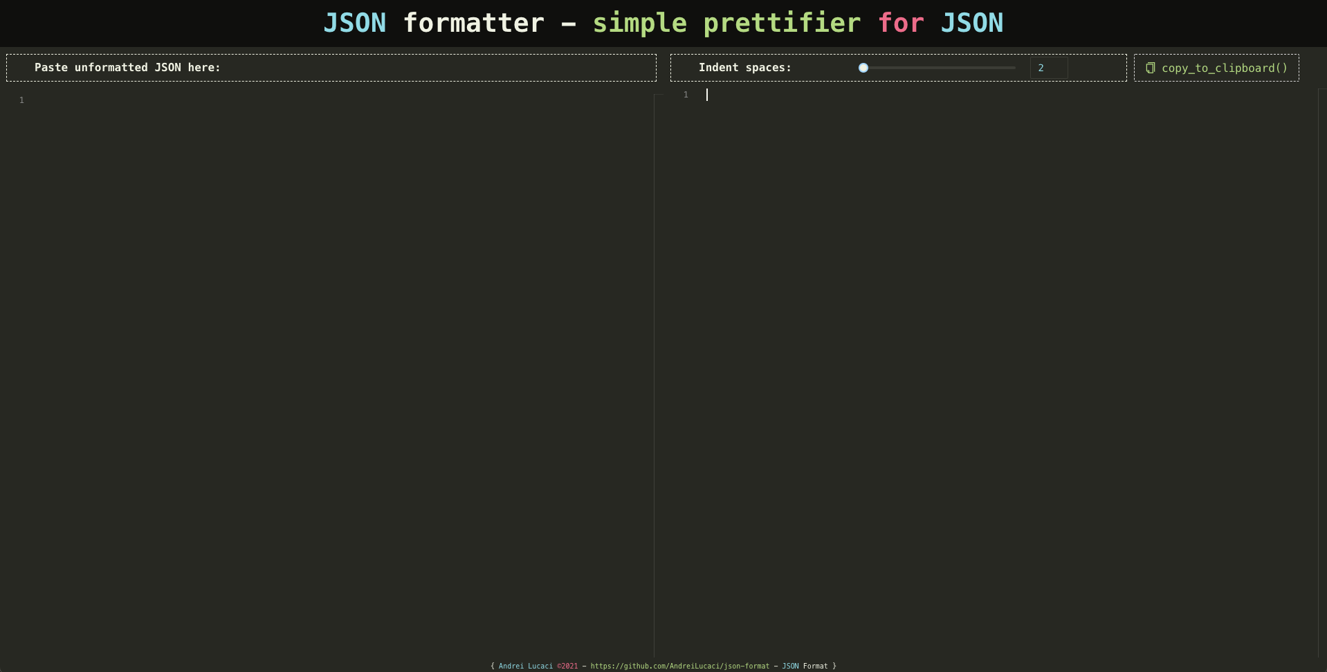 json-format: "JSON formatter - simple prettifier for JSON" - https://jsonf.io Demo You can try it out here: Demo - Click ME Description Small json format utility interface. Interface