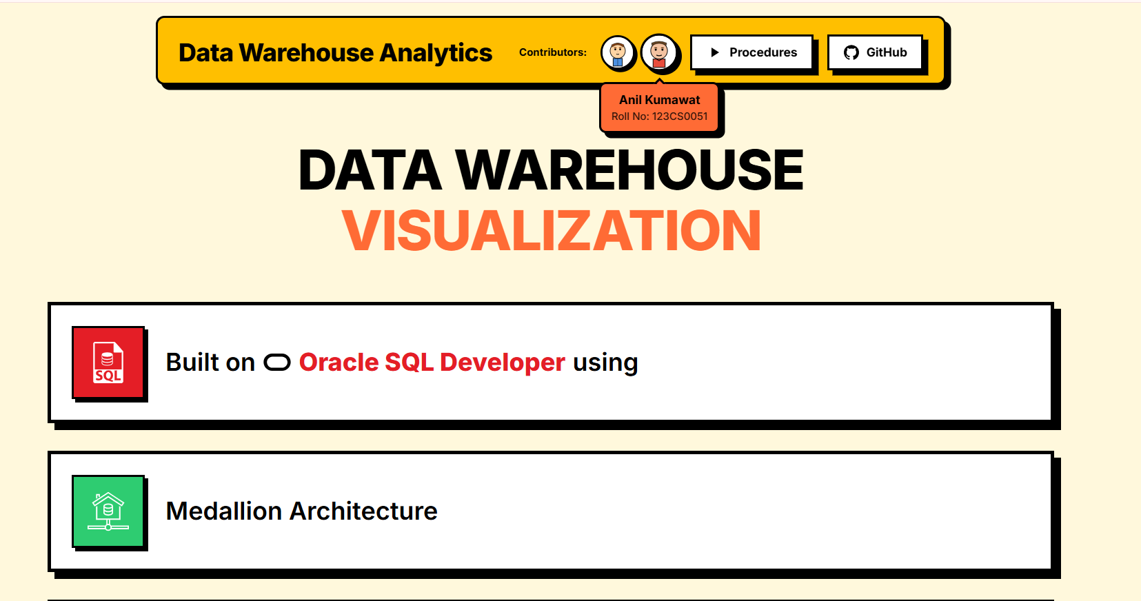 End-to-end Data Warehousing System leveraging Oracle SQL and Medallion Architecture for scalable data processing and analytics. |