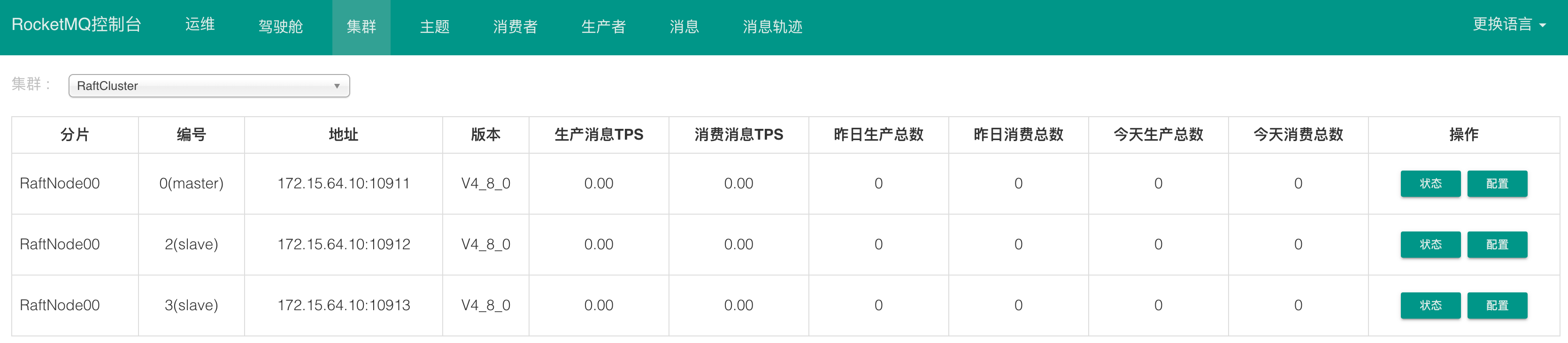 RaftCluster RaftNode00 0 172.15.64.10:10911 V4_8_0 0.00(0,0ms) 0.00(0,0ms) 0 447918.62 -1.0000