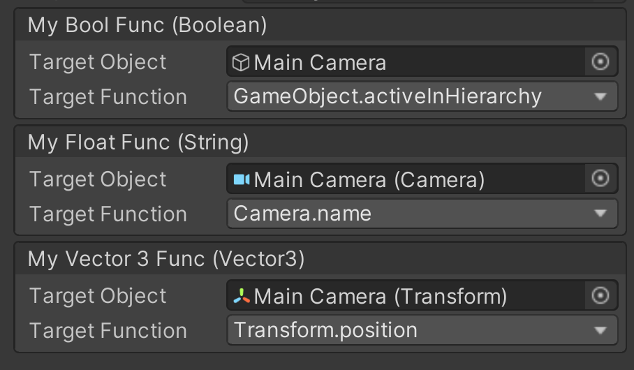 A UnityEvent for function calls with a return value. Allows you to assign Func<T> via the Inspector. Looks and acts like a UnityEvent. Supports both GUI and UI Toolkit. Tested with Unity 2020.3, 2021.3, 2022.2, 2023.1. Tested in standalone Windows and Android builds, both with Mono and IL2CPP. Version 1.1 supports generic parameters. If there are no generic parameters for the func, you'll also be able to assign getter properties.