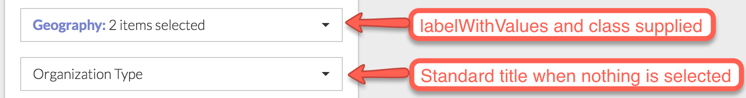 | labelClass | string | Requires labelWithValues attribute. optional class to style label when item(s) are selected. Label is wrapped in a strong tag when items are selected. |