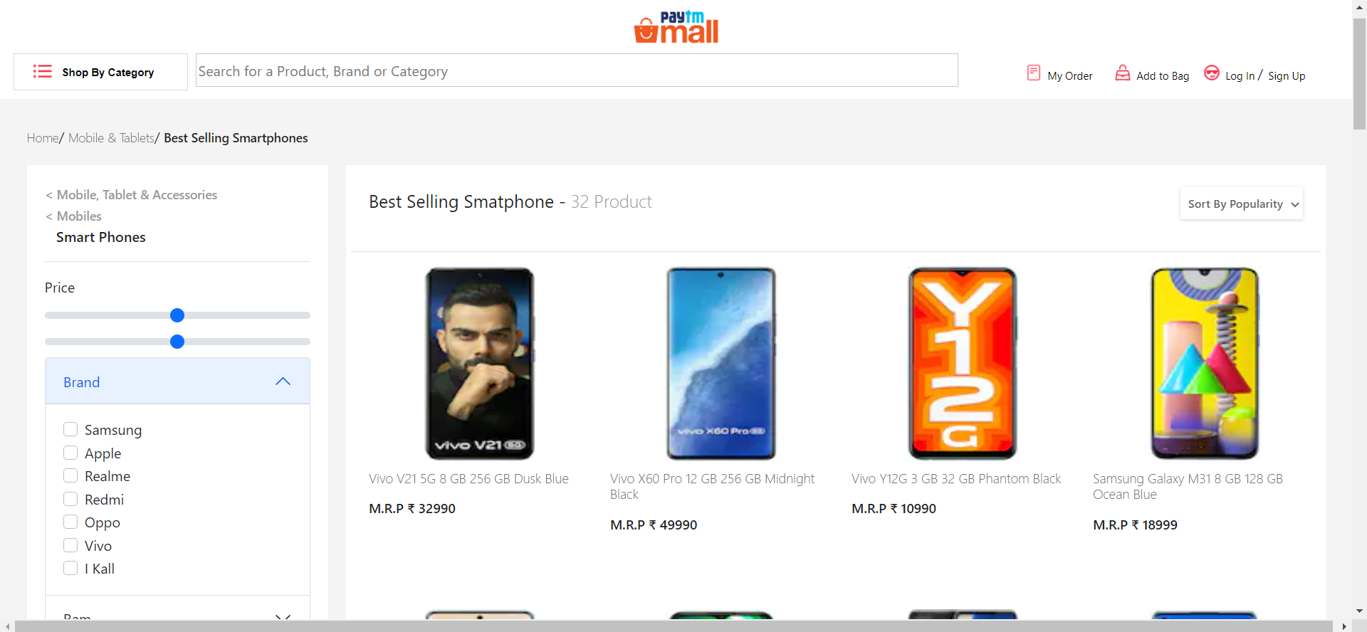 Smartphone page shows different phones sorted by price“ low to high” and “High to Low” .