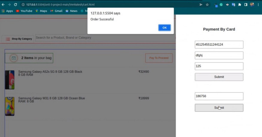 First you have to have to go to the signup page and create a new account. Then you will get an alert that signup successful. After the signup process is completed you have to login with the same details and it wil redirect you to the landing page. You can now go to the category page and navigate to add products to the cart. After that you can proceed to the cart page then after clicking on checkout button you will be redirected to the payment page there you can add your payment details and after clicking on pay now button, you will get an alert of successful payment.