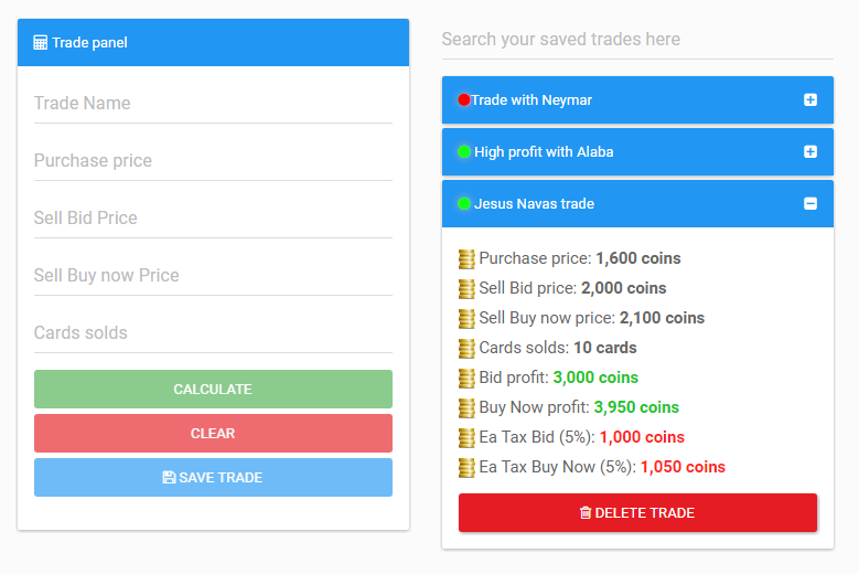 The FUT Calculator was created to help players of FIFA Ultimate Team to calculate your profits and losses easily and quickly on Transfer Market. This one is the WEB version of the Calculadora FUT APP on Play Store. FUT Calculator was written 100% in JavaScript and works totally on client side.