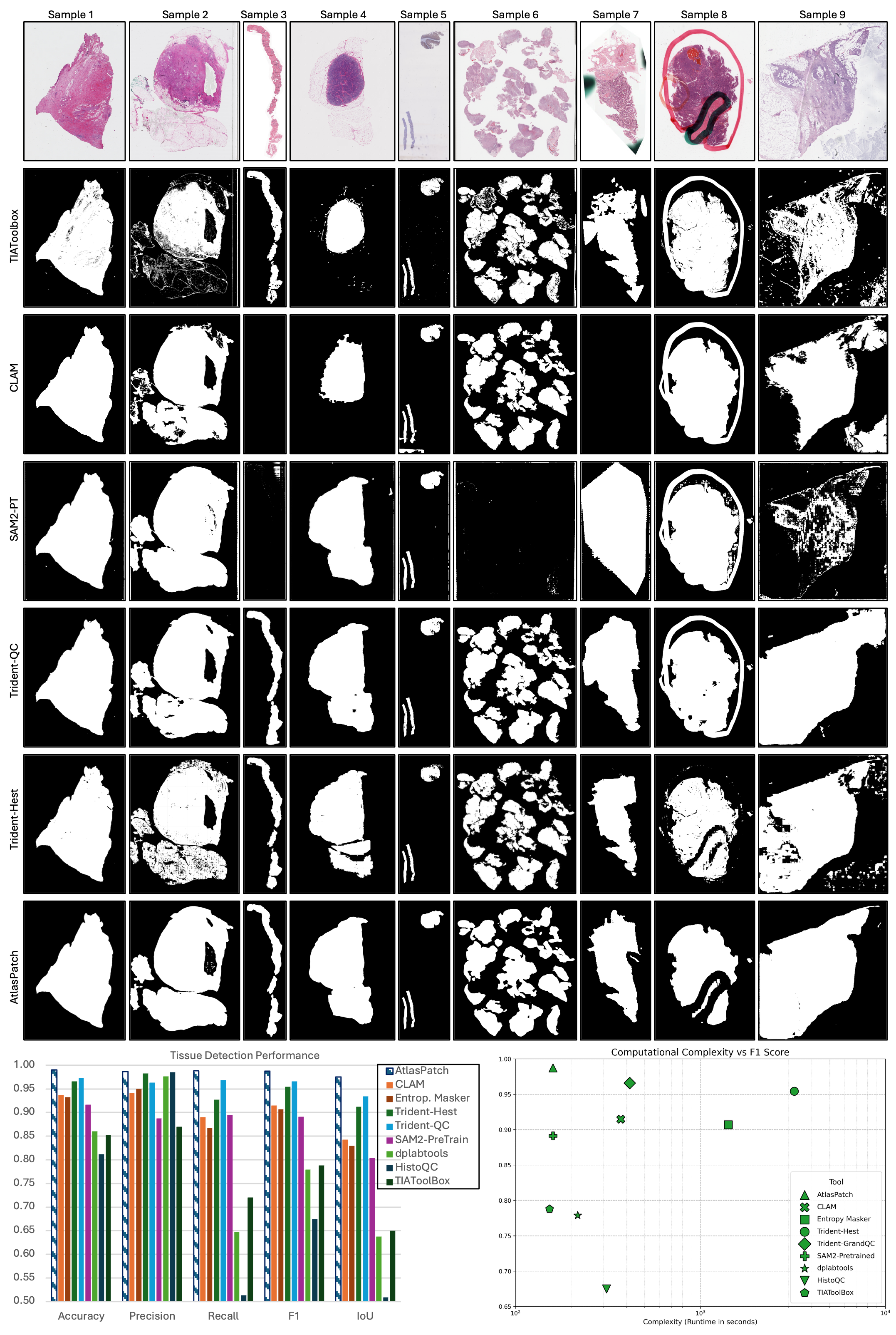 Quantitative and qualitative analysis of AtlasPatch tissue detection against existing slide-preprocessing tools.
