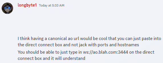 TL;DR * Allow direct connect to allow syntax such as this: `tcp://hostname.com:4997`, `ws://trashofthe.net:5000`, ...