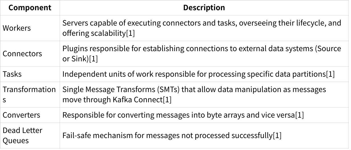 Kafka Connect is a framework and toolset for building and running data pipelines between Apache Kafka and other data systems. It provides a scalable and reliable way to move data in and out of Kafka, making it simple to quickly define connectors that move large data sets into Kafka (source connectors) or out of Kafka to external systems (sink connectors)[7].