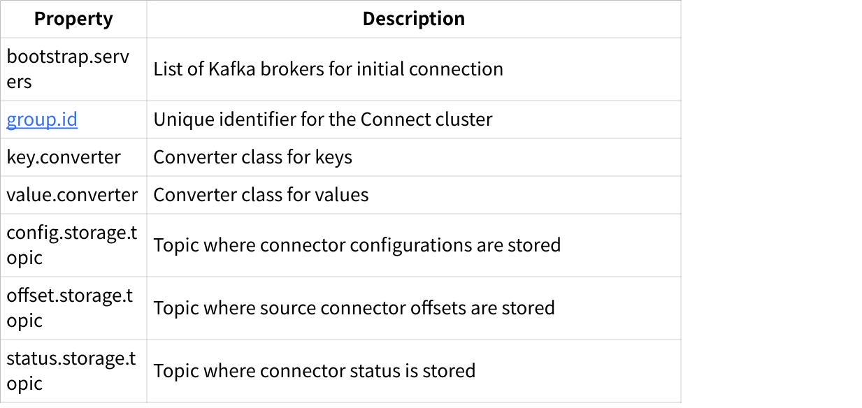 Worker configuration defines properties for the Kafka Connect runtime environment. Key properties include: