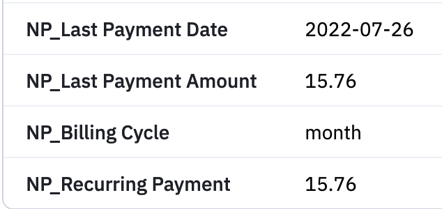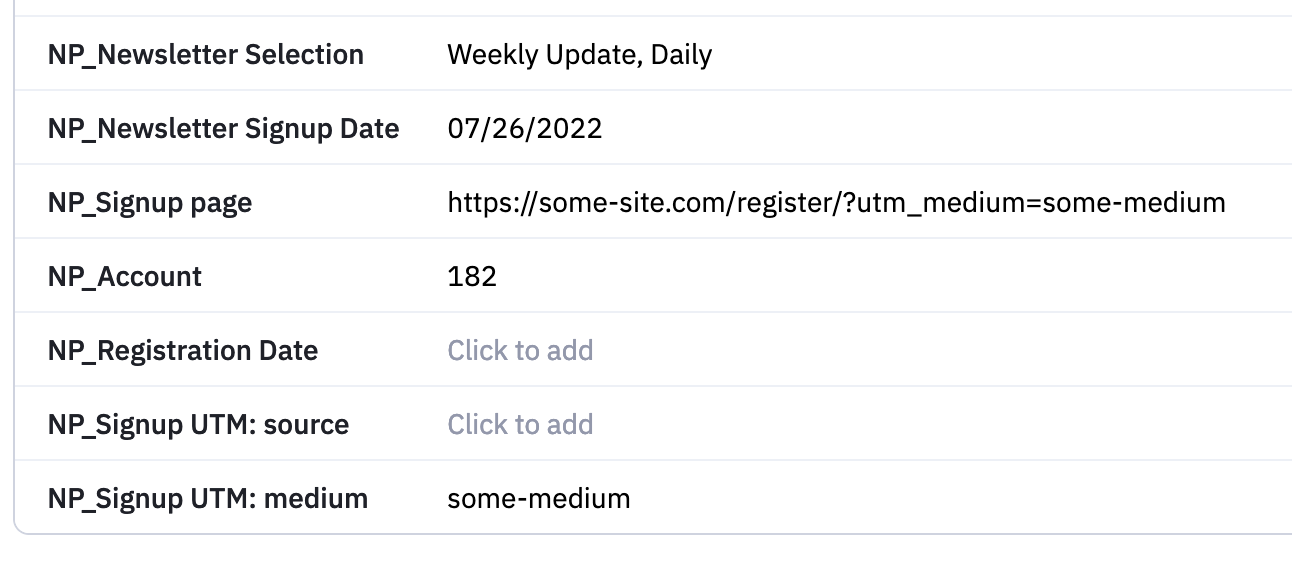 NP_Account– WP user IDNP_Registration Date– only if registered without signing up for a listNP_Newsletter Signup Date– only if registered and signed up at the same timeNP_Newsletter Selection– a comma-separated list of lists the user signed up toNP_Signup pageNP_Signup UTM: <source|medium|campaign>– UTM params, if present in URLNP_Last Payment DateNP_Last Payment AmountNP_Billing CycleNP_Recurring PaymentOther information: