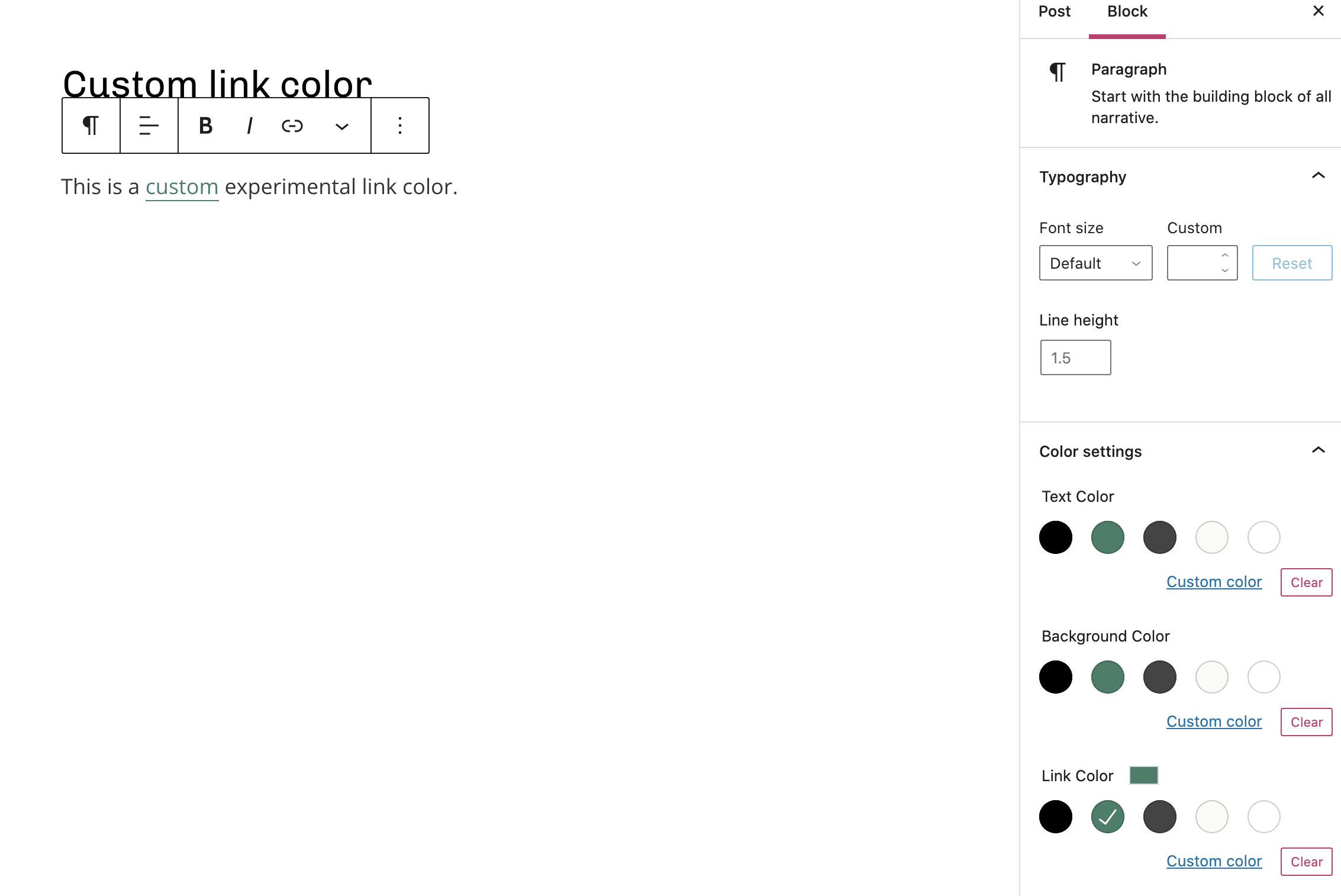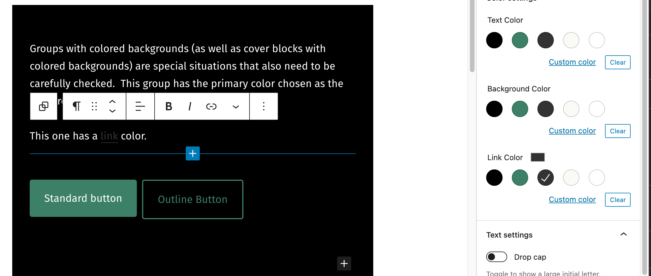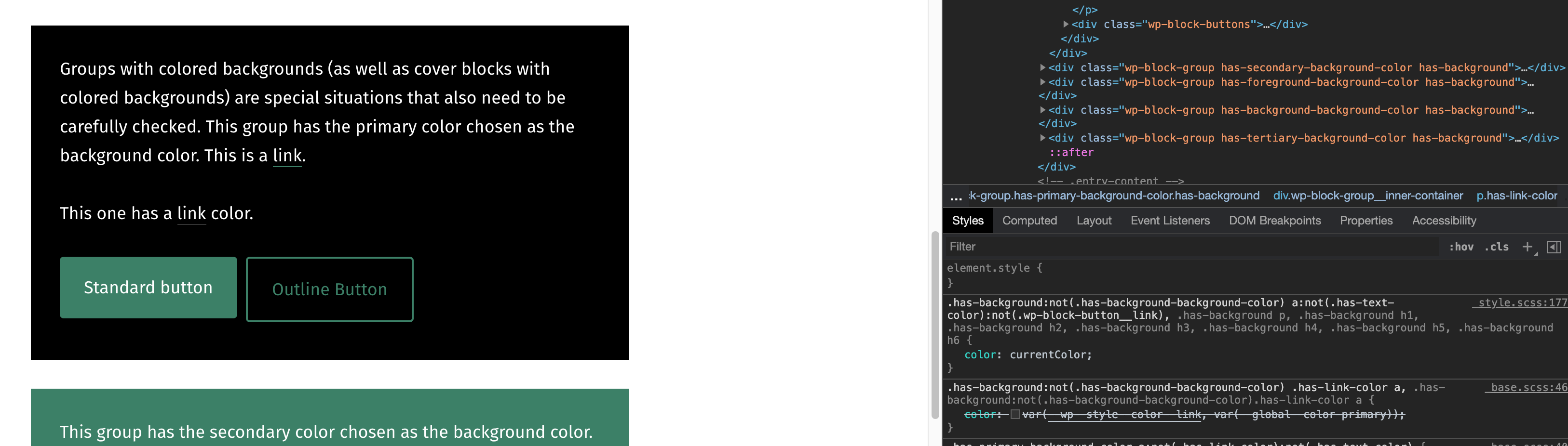 I found and fixed an issue with the cover block specifically where the specificity of some anchor styling was preventing the 'link' style from cascading properly. I suspect there are other blocks with the same situation, I'll comb through spearhead and see where else it might be occurring. @jeffikus I was unable to reproduce your screenshot however (tested both Spearhead and Seedlet). It only KINDA happened for me when I was testing and had SEEDLET in the editor, switched themes (but didn't reload the editor) and set the color to that green (secondary color) which isn't a color provided by Spearhead so it rolled back to the 'default'. But that seems like I was trying too hard... |