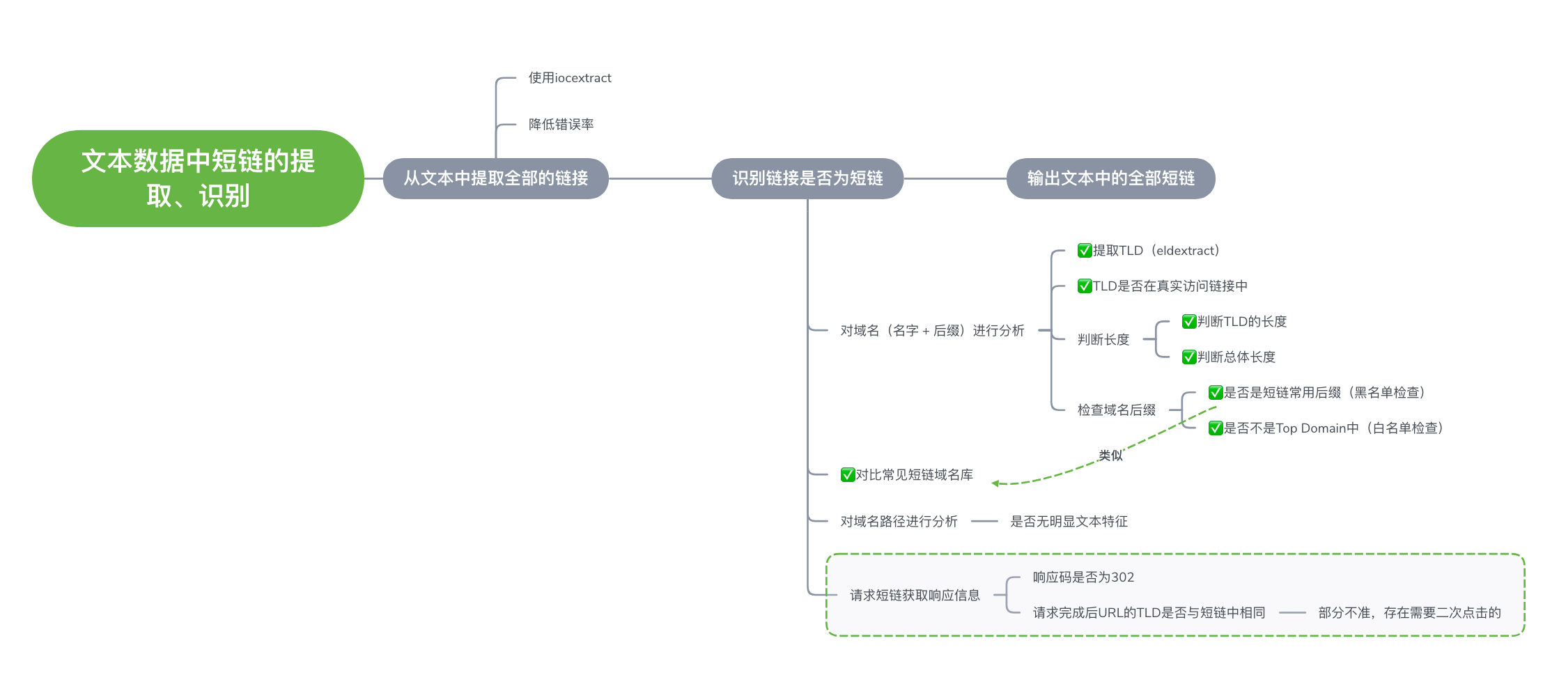 {'https://zeek.ir/huhsdfods': 'zeek.ir', 'https://virl.com/jdfiehoifn': 'virl.com'}目前完成了URL提取的简单降噪以及本地(离线)的短链识别。还有以下几个方面需要提升: