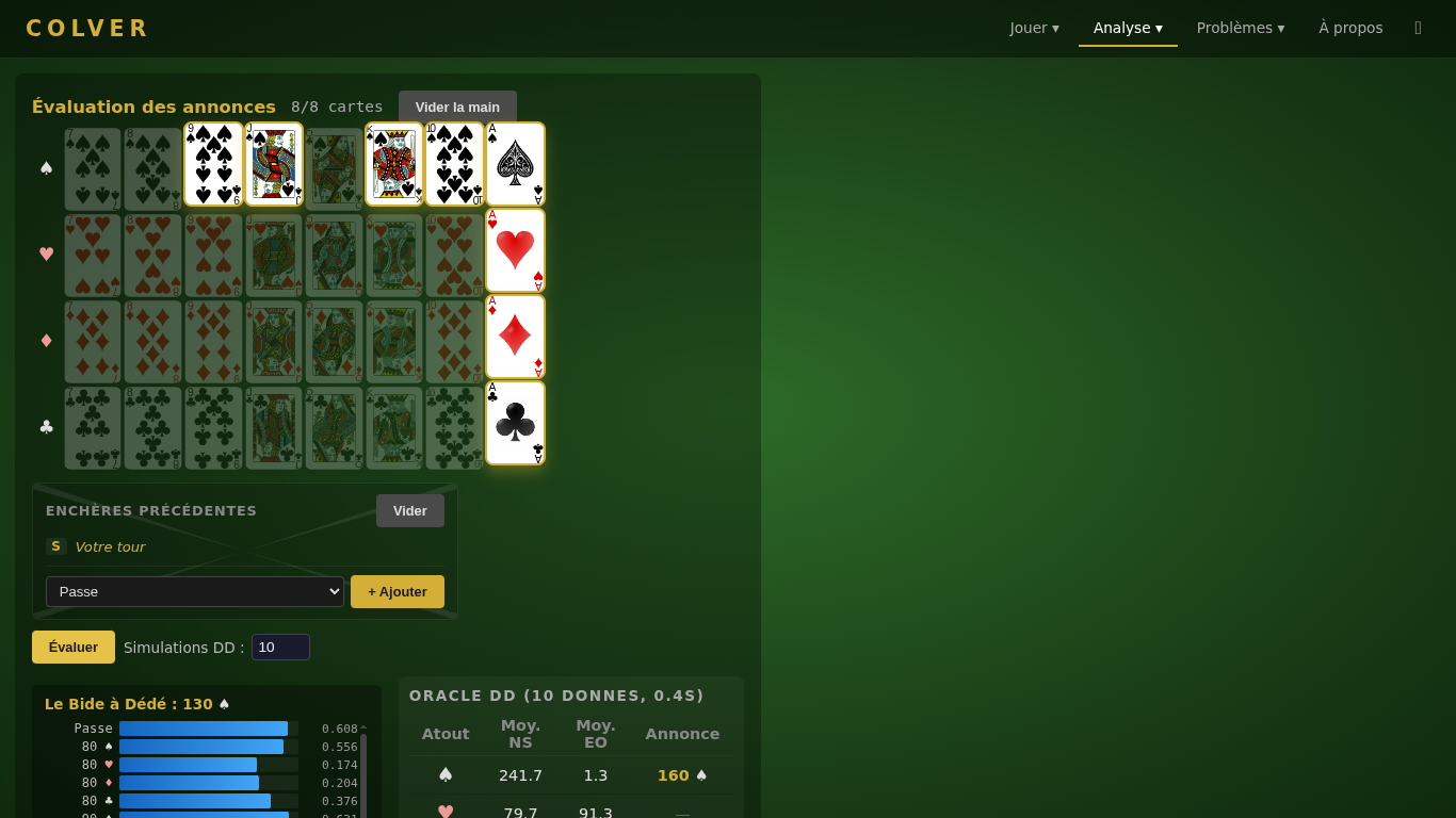 Annonces — Compose an 8-card hand, choose your position in the bidding round, and see what Bid a Dede (the NN bidder) would bid — with Q-values for every legal action.