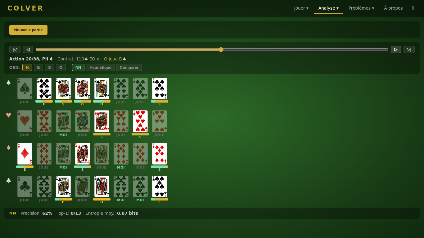 Croyances — Visualize how the belief network and heuristic model predict card locations as a game progresses. Generate a random game, step through it, and see per-card probability bars with ground truth overlay and accuracy stats. Switch observer perspective (N/E/S/W) and compare NN vs heuristic predictions side by side.