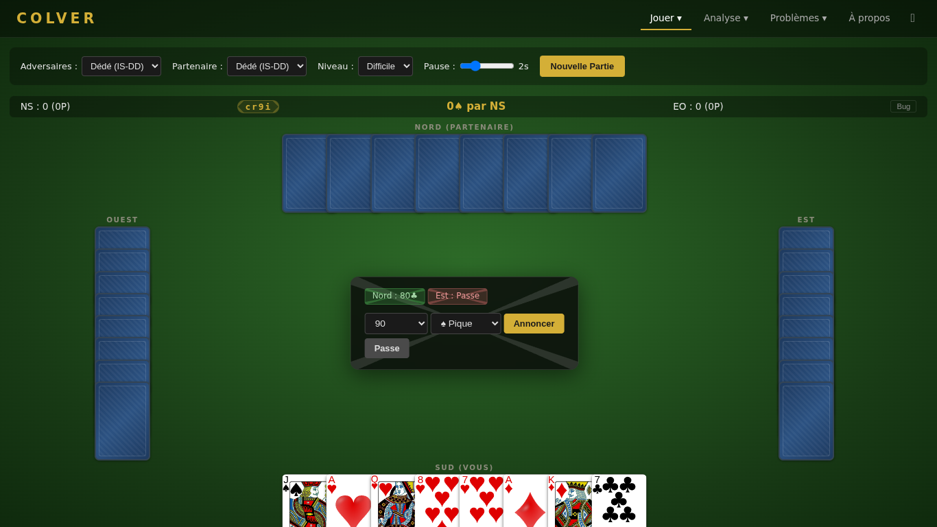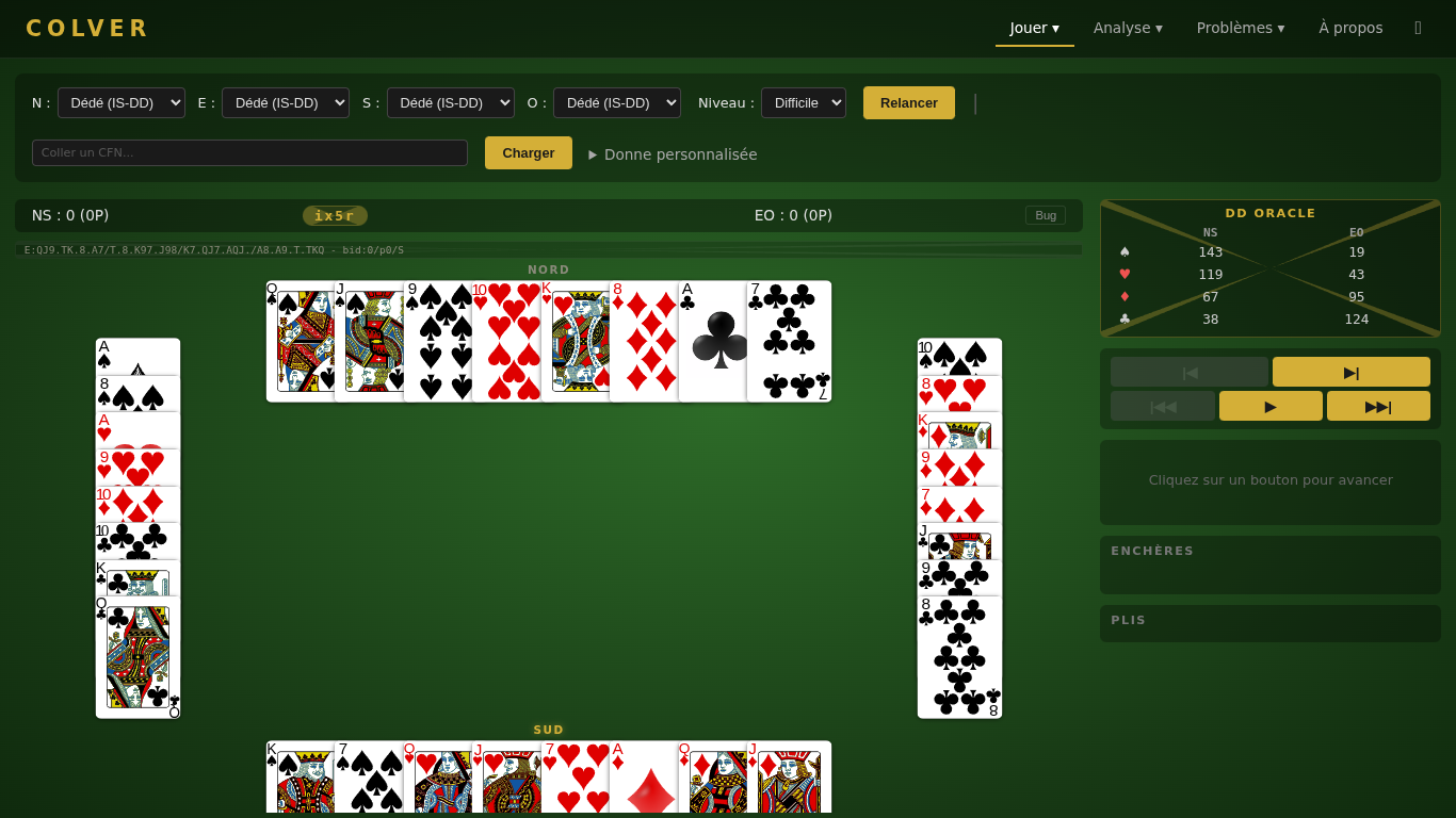 Problemes de jeu — Card play practice problems. See a mid-game position and find the best card. Compare your choice to the DD solver's optimal play.