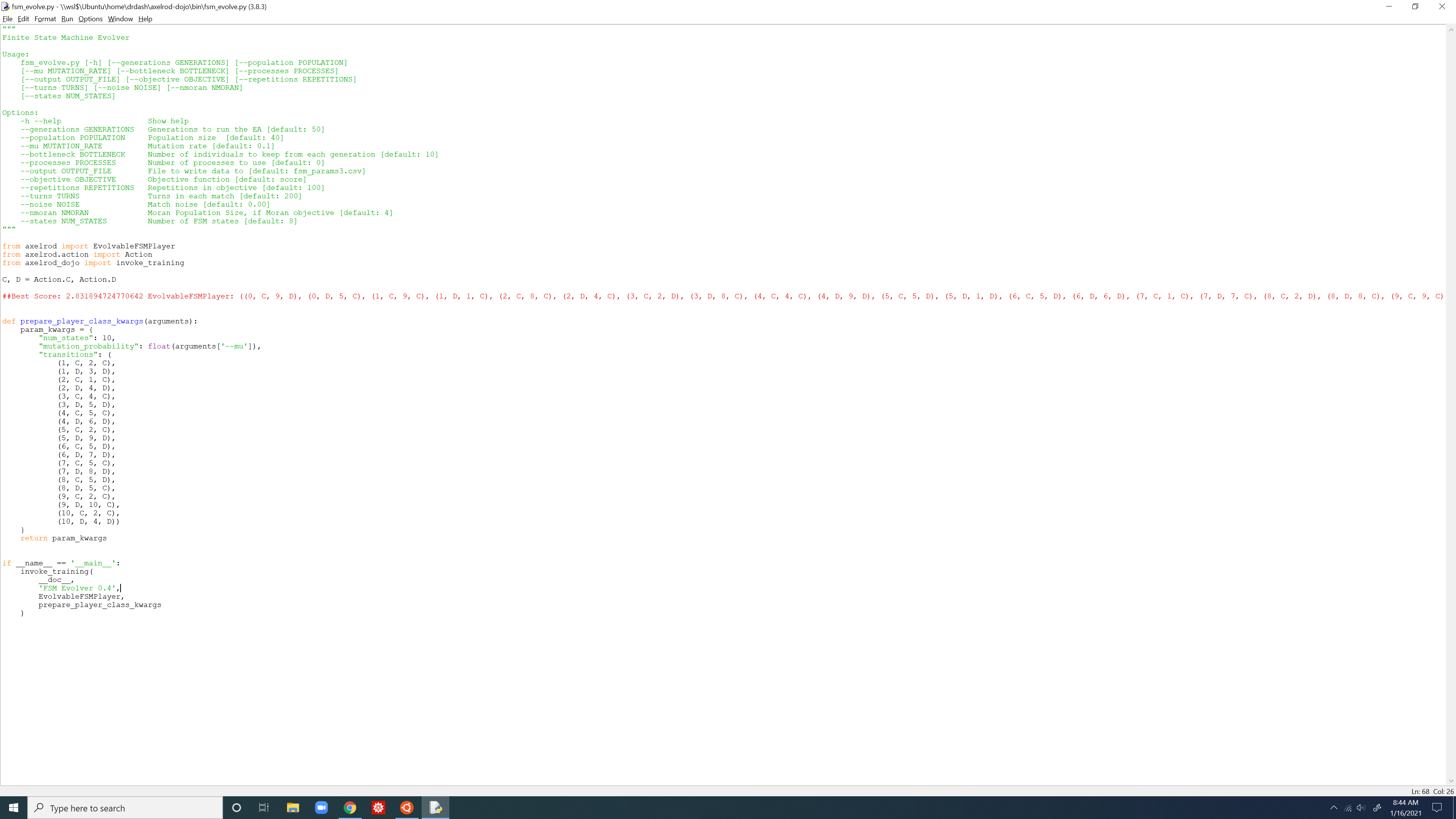 I am great with the name change and I should have had the student(s) check for accessible branches. Sorry @marcharper, I was answering @drvinceknight's question. Below, you can find all the specifics. We used all the default options for fsm_evolve except for the output_file, num_states (10 instead of 8), and generations (500 instead of 50). I am running axelrod-dojo version 0.0.8 and axelrod version 4.10.0. So yes, we trained against short_run_time_strategies for 500 generations, population size of 40, mutation rate at 0.1, bottleneck at 10, processes at 0 (in Ubuntu), objective set to score, 200 turns, 0 noise. Last semester we found the easiest way to invoke training with a specific starting point was to add transitions directly to prepare_player_class_kwargs with everything else set in Options and using the EvolvableFSMPlayer provided by @marcharper as the player class. |