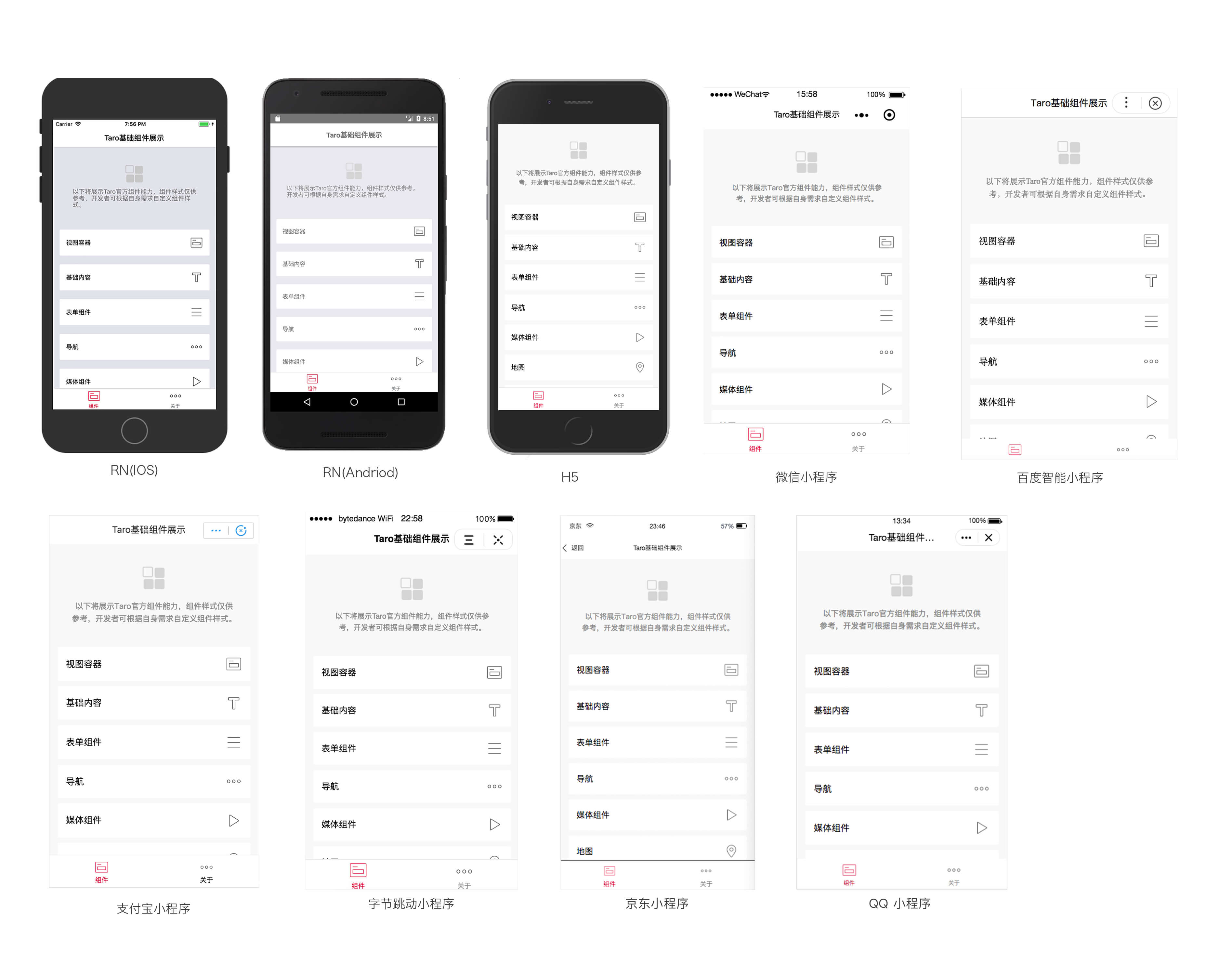 Taro 方案的初心就是为了打造一个多端开发的解决方案。目前 Taro 代码可以支持转换到 微信/百度/支付宝/字节跳动小程序 、 H5 端 以及 移动端(React-Native)。