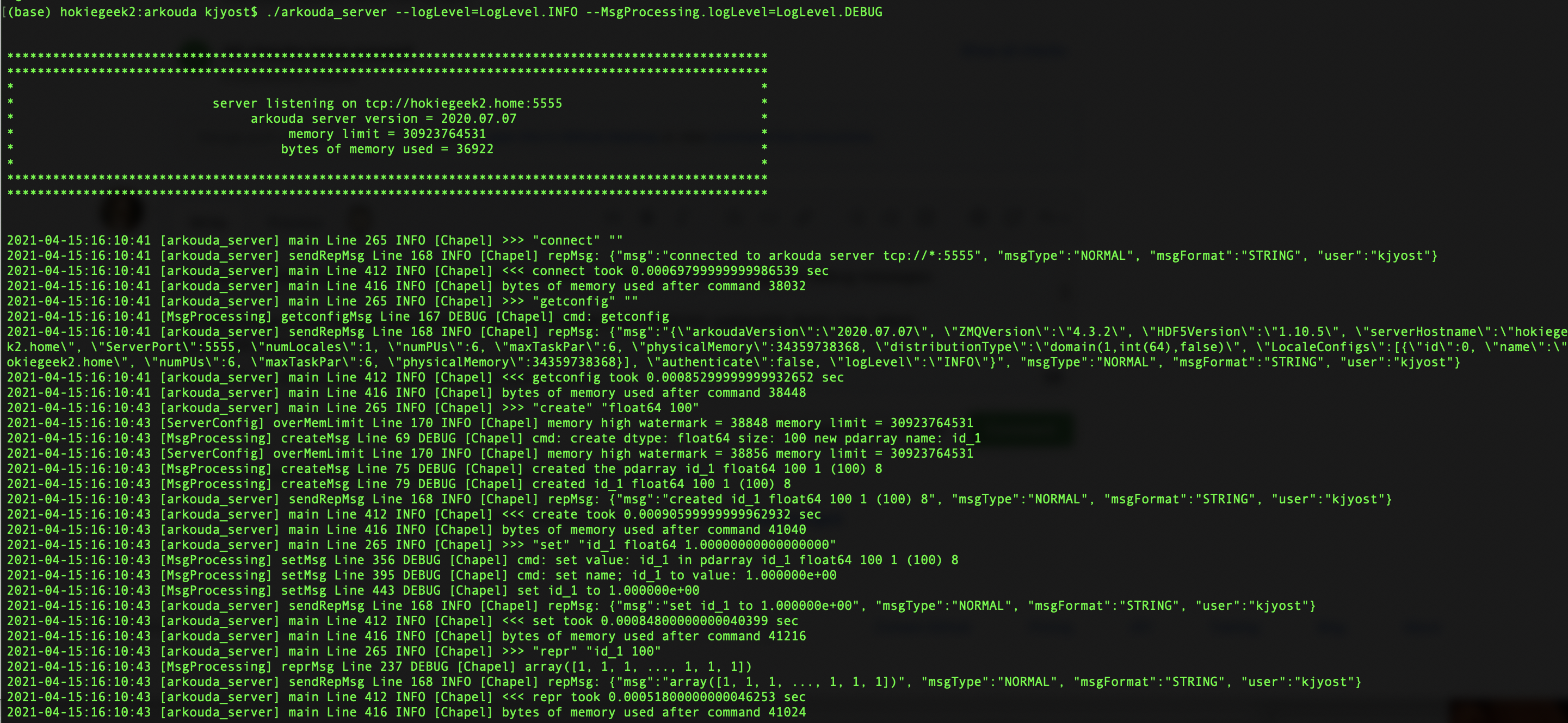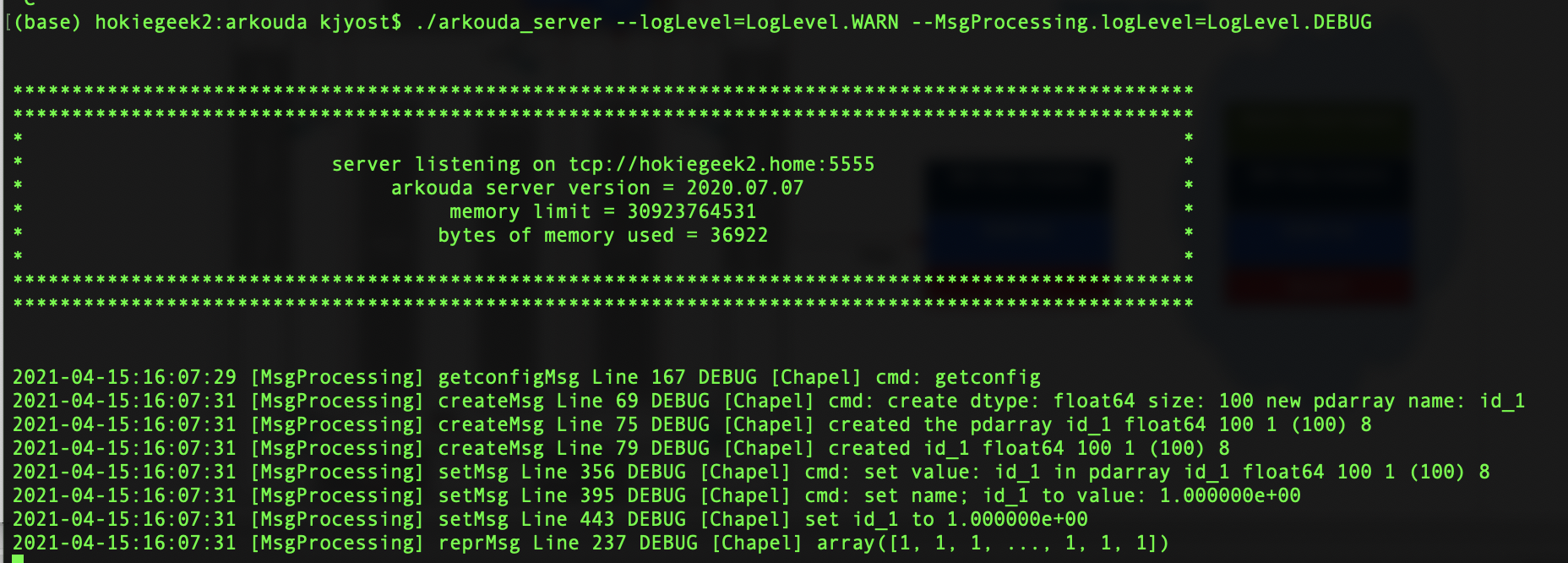 setting logLevel to INFO via the --logLevel=LogLevel.INFO leads to just INFO,WARN,ERROR,CRITICAL messages to be printed from all modules: setting the global logging level at INFO and MsgProcessing to DEBUG results in targeted debug messages: logging is strongly quieted if the global logging level is set to WARN, enabling focus on the MsgProcessing module: |
