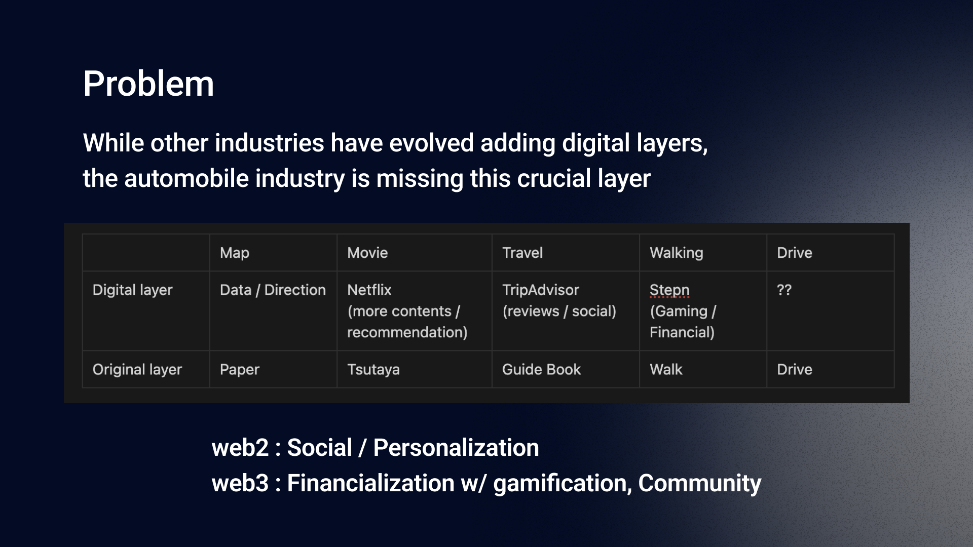 In a digital age where many industries have embraced digital and interactive layers, the automobile industry has lagged behind. While Web2 introduced social and personalization aspects to various sectors, the integration of Web3's financialization with gamification and community involvement is still a missing piece in the automotive world.