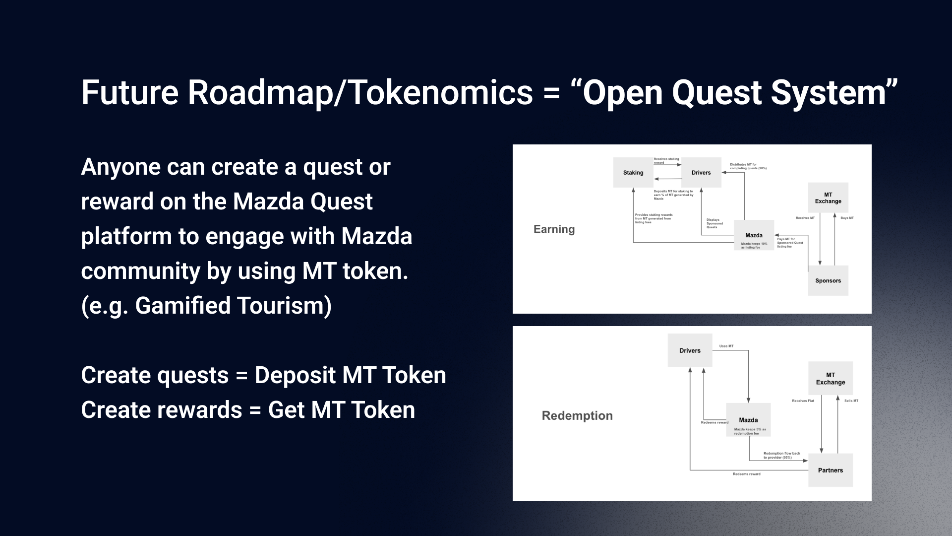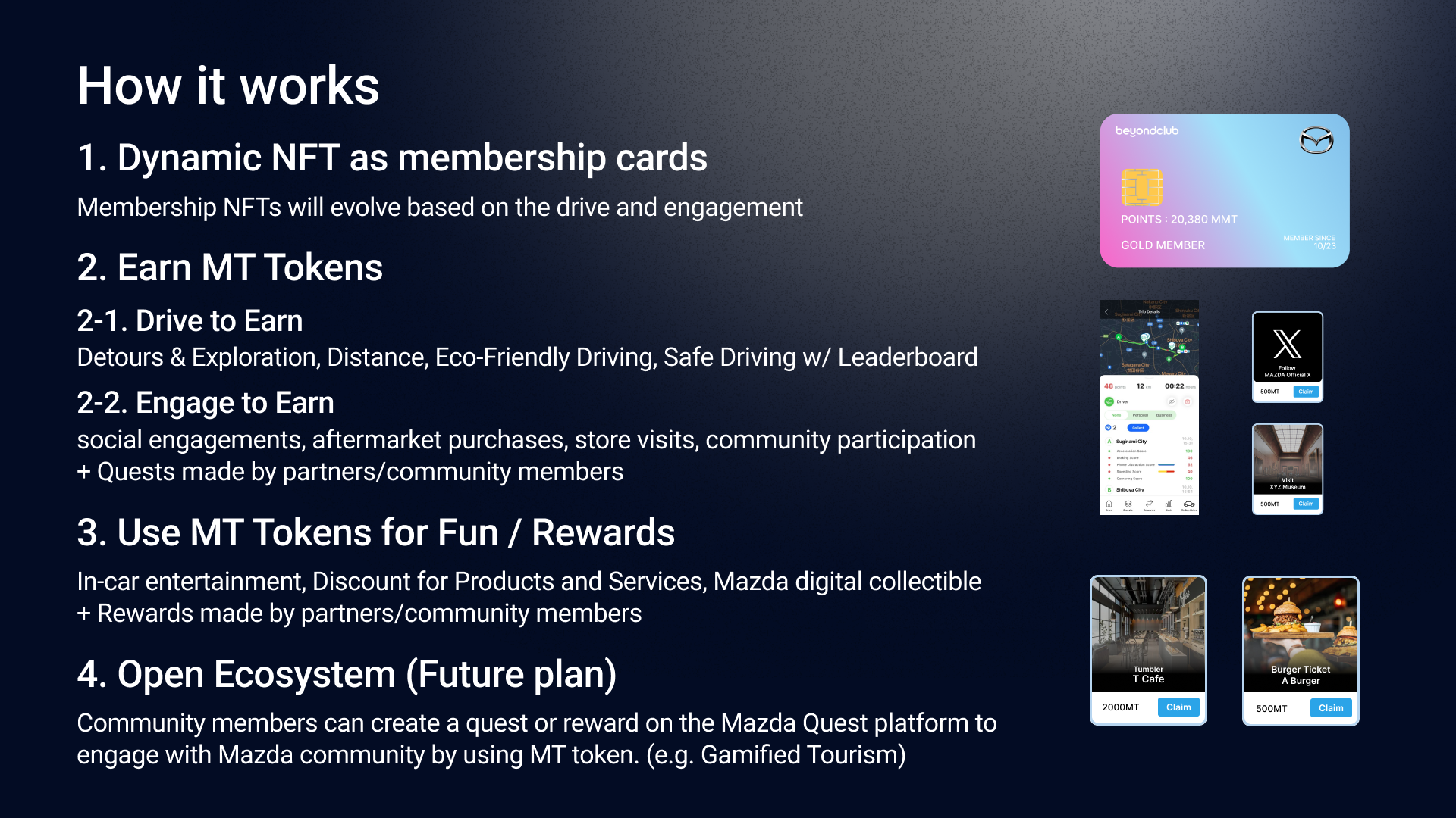 MAZDA QUEST aims to revolutionize the driving experience by leveraging Web3 technologies. It introduces the Mazda Token (MT), designed to reward drivers, passengers, and community members for engaging with their vehicles and the broader Mazda community.
