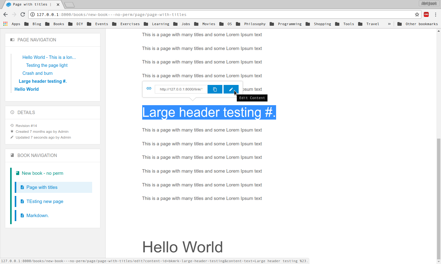 This adds an edit icon next to each header in the page. On clicking of this edit icon, the editing window is opened and the header text is put in focus. This works on the WYSIWYG editor.