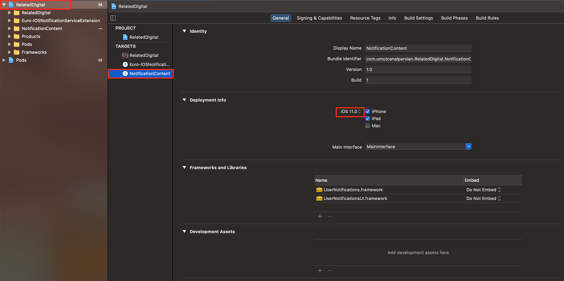 - In the project navigator, select the top-level project directory and select the NotificationContent target in the project and targets list. Unless you have a specific reason not to, you should set the Deployment Target to be iOS 11.