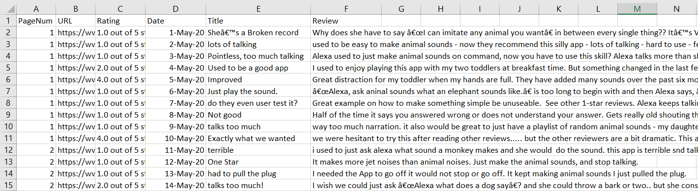 Amazon-Review-Crawler Crawl and extract amazon reviews and store it onto a local csv file. The script takes in an an Amazon product review page and parses the information into a csv file with each row input containing: URL to the review Rating (out of 5) Date the review was posted Title of the review Review content