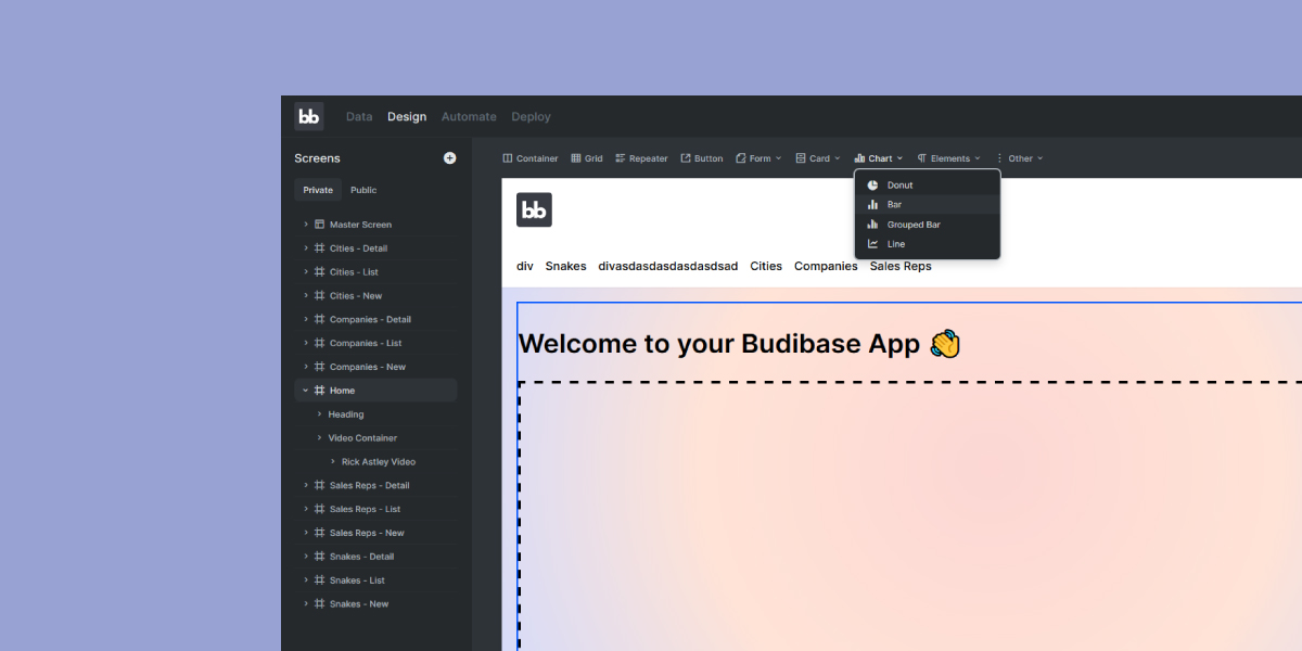 Design and build apps with powerful pre-made components. Budibase comes out of the box with beautifully designed, powerful components which you can use like building blocks to build your UI. We also expose a lot of your favourite CSS styling options so you can go that extra creative mile. Request new components.