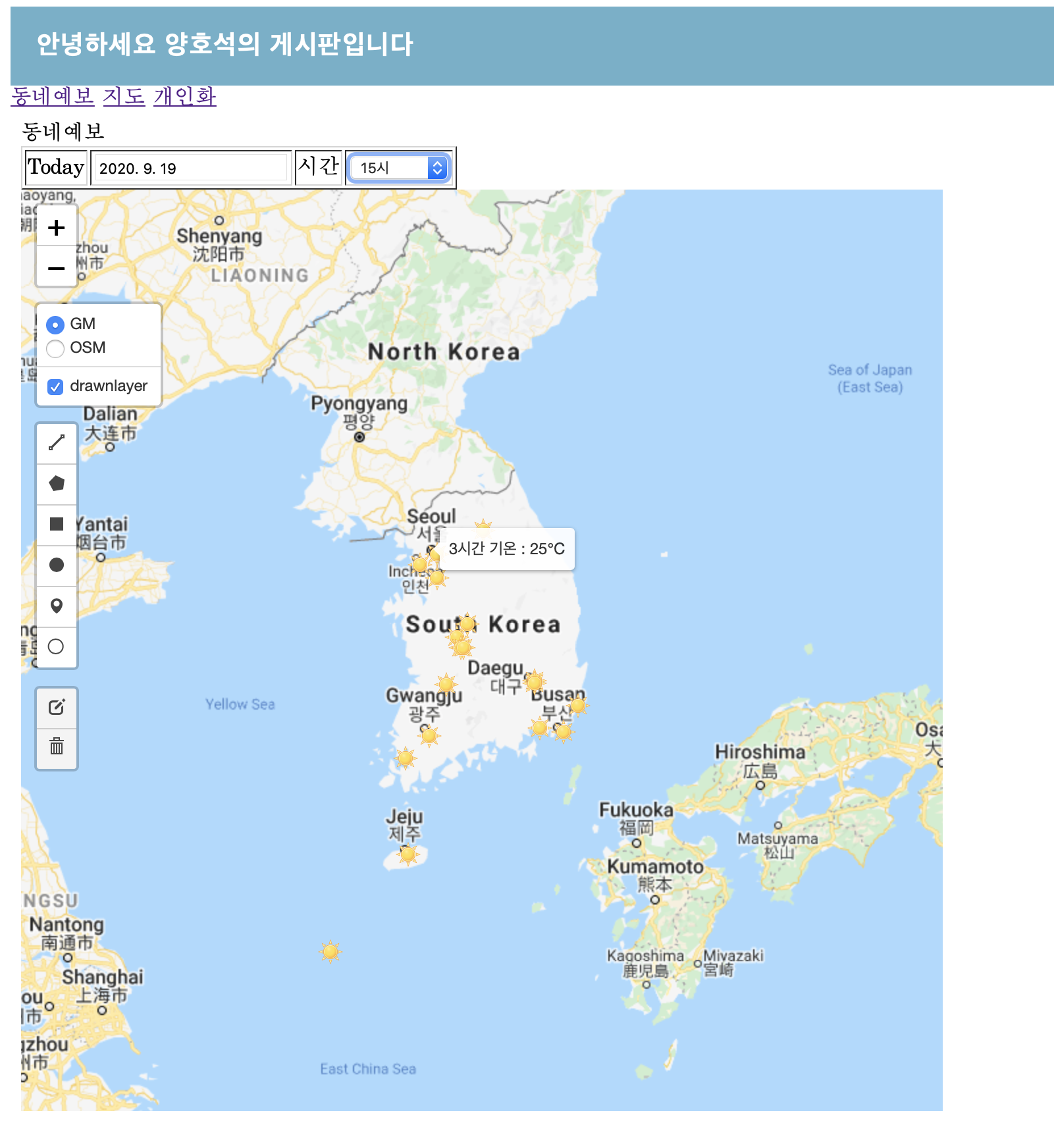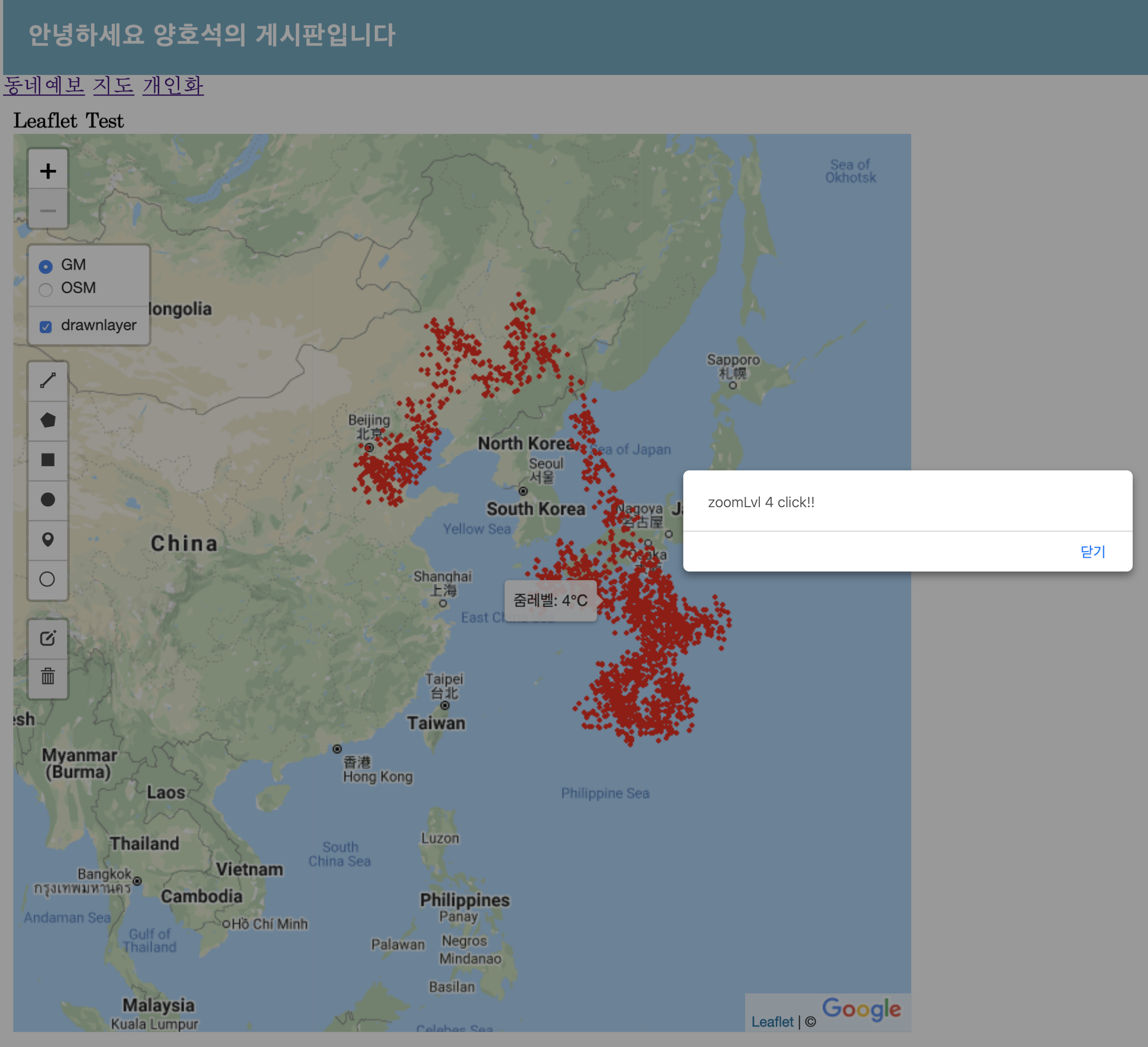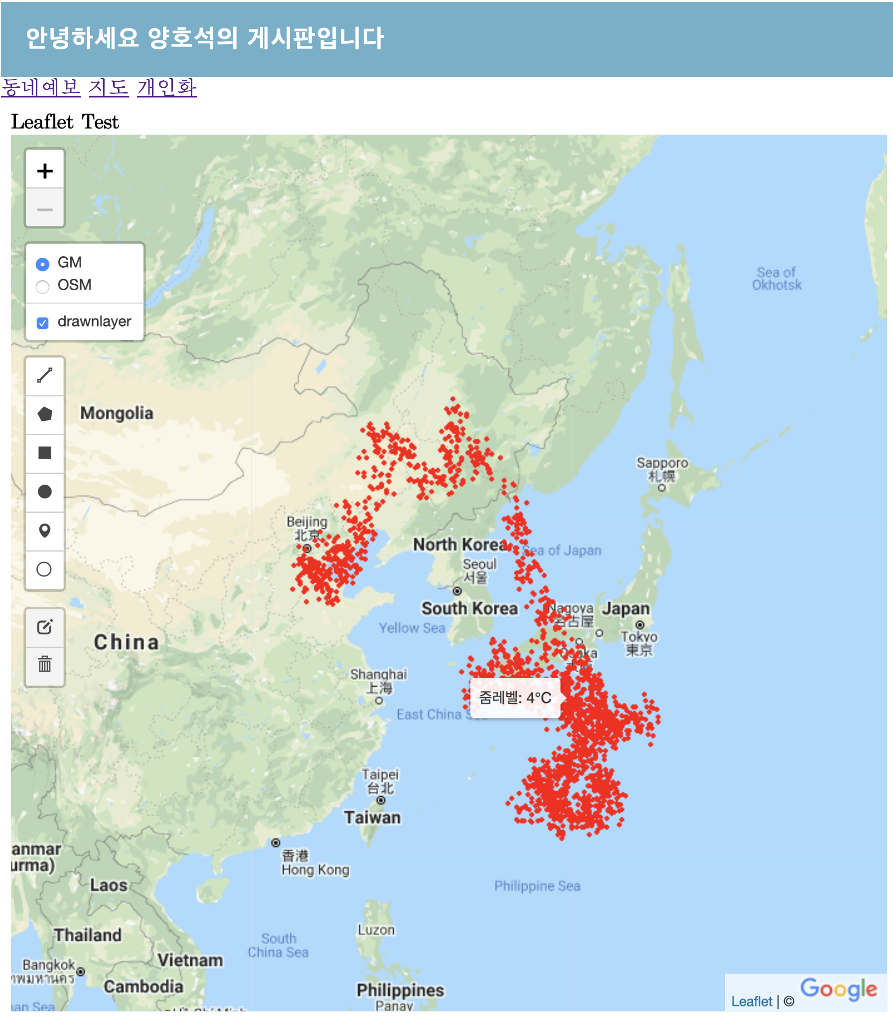 Leaflet 공부 토이 프로젝트 2019.06. 개발환경 SpringBoot 2.1.5 MySQL HTML / CSS / JS 지도 library : Leaflet.js 동네예보 API통한 날씨 표출 Leaflet CanvasIconLayer 프로토타입 지점 표출을 위한 canvasIconLayer 프로토타입 지점 개인화를 위한 화면 프로토타입