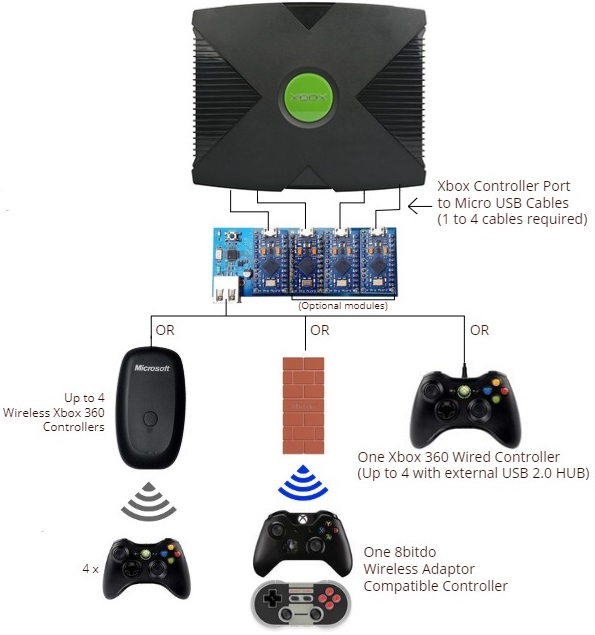 The ogx360 is a small circuit board which allows you to use Wireless Xbox 360 Controllers via an Xbox 360 Wireless Receiver on the Original Xbox Console.