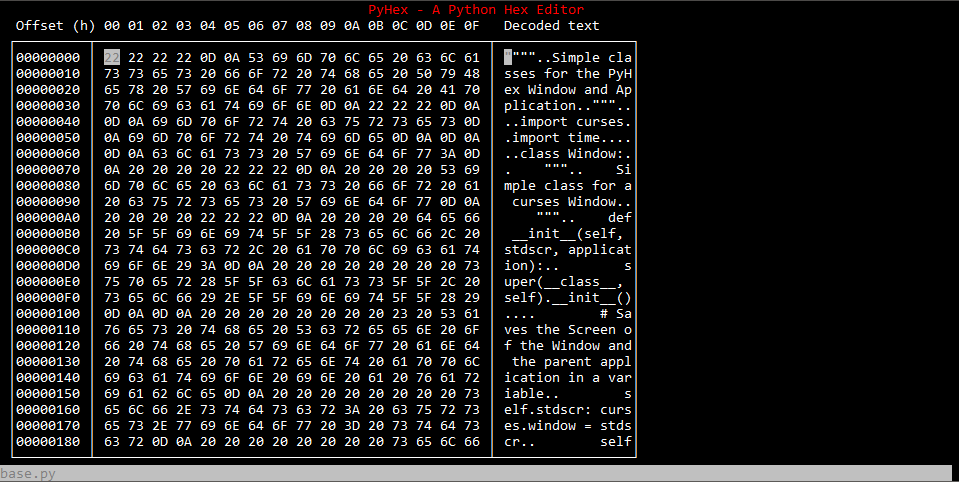 PyHex is a simple python hex editor for the terminal