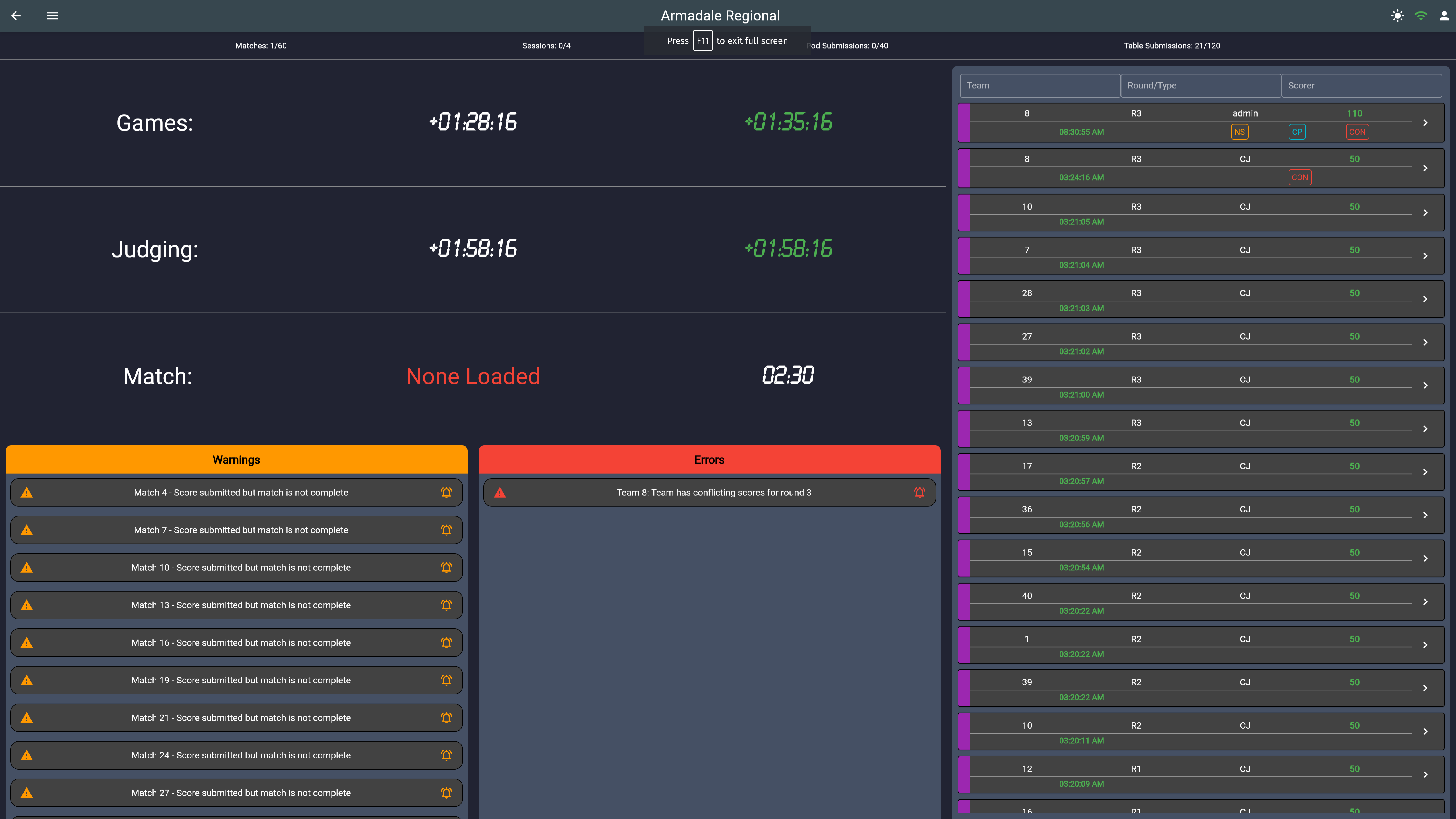 - FLL Event Management System: A comprehensive and locally hosted solution for scoring, storing and ignoring. Replacing paper and hard set schedules for live modifiable event data. Including digital scoring, timers, live schedules, scoreboards, match/score tracking, snapshots rollbacks and more.