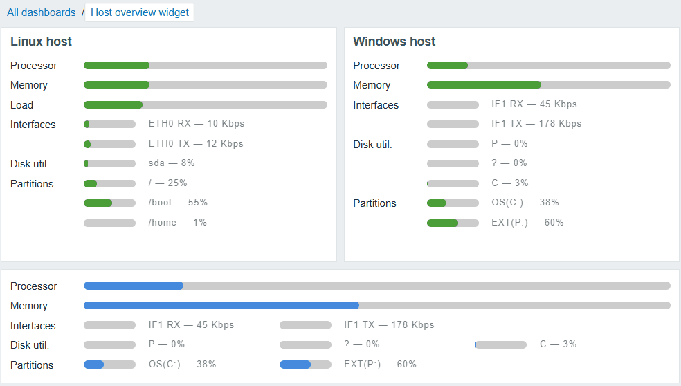 This widget relies on predefined item-name patterns to detect which metrics to display. These patterns are based on the default item names in the official Windows and Linux templates that ship with Zabbix. The item names must match the schema below. If you are using the standard Linux and Windows templates version 7.0-2 or higher and have not renamed any items, you are compatible.