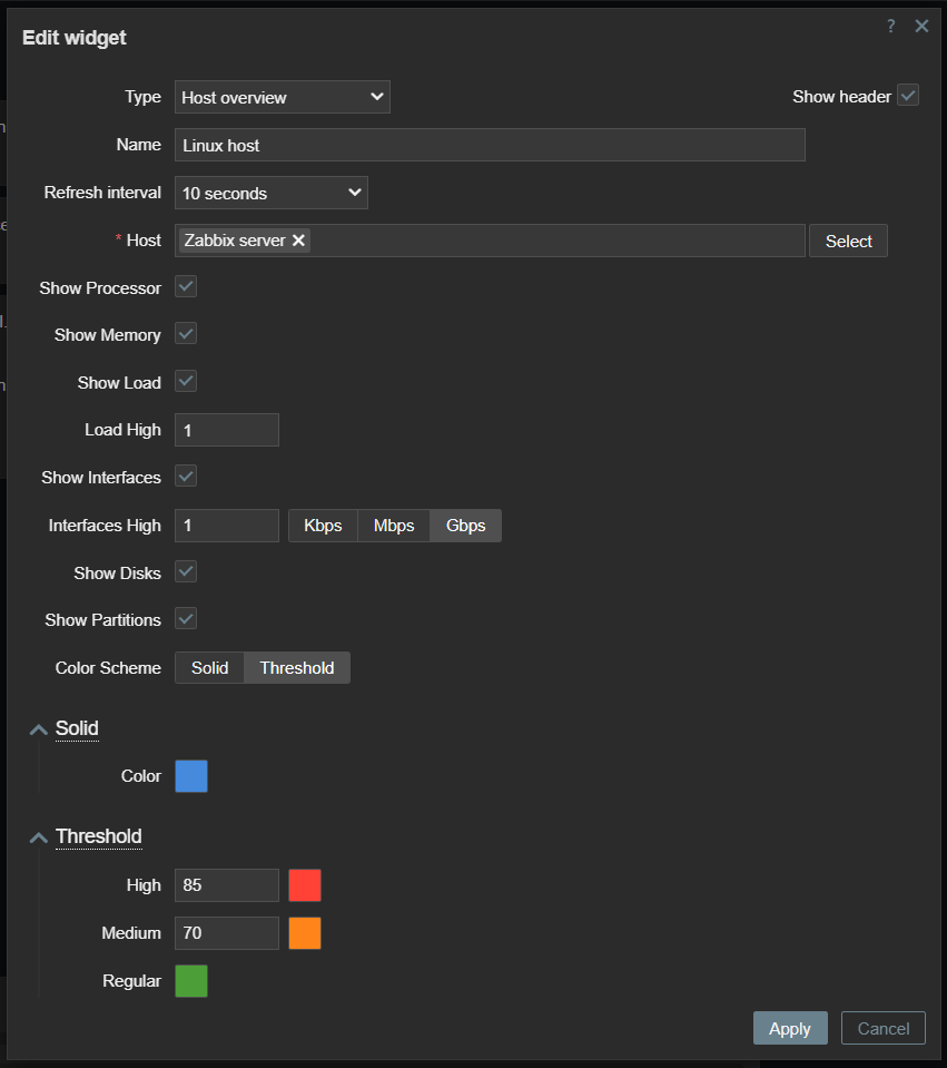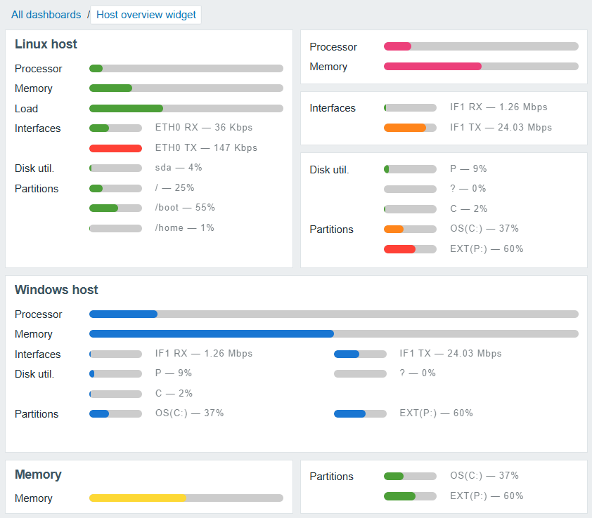 A widget for showing host metrics in a clean, compact way. You choose which metrics appear, set your own thresholds and adjust colors. Multi-item metrics are grouped neatly and values update live.