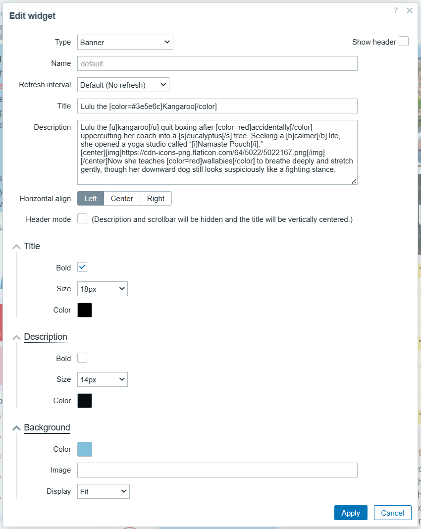 A widget for creating custom visual banners on your dashboard. Displays titles, descriptive text, and background images with lots of styling options. Perfect for highlighting key information, adding aesthetic elements or adding inline comments to your dashboard.