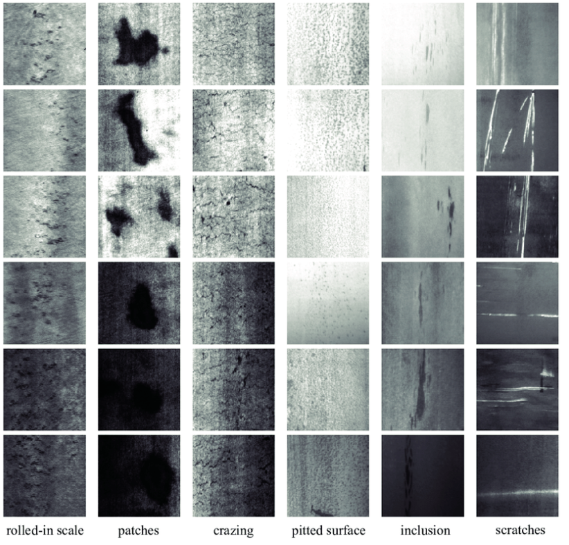 The surface defect dataset released by Northeastern University (NEU) collects six typical surface defects of hot-rolled steel strips, namely rolling scale (RS), plaque (Pa), cracking (Cr), pitting surface (PS), inclusions (In) and scratches (Sc). The dataset includes 1,800 grayscale images, six different types of typical surface defects each of which contains 300 samples. For defect detection tasks, the dataset provides annotations that indicate the category and location of the defect in each image. For each defect, the yellow box is the border indicating its location, and the green label is the category score.