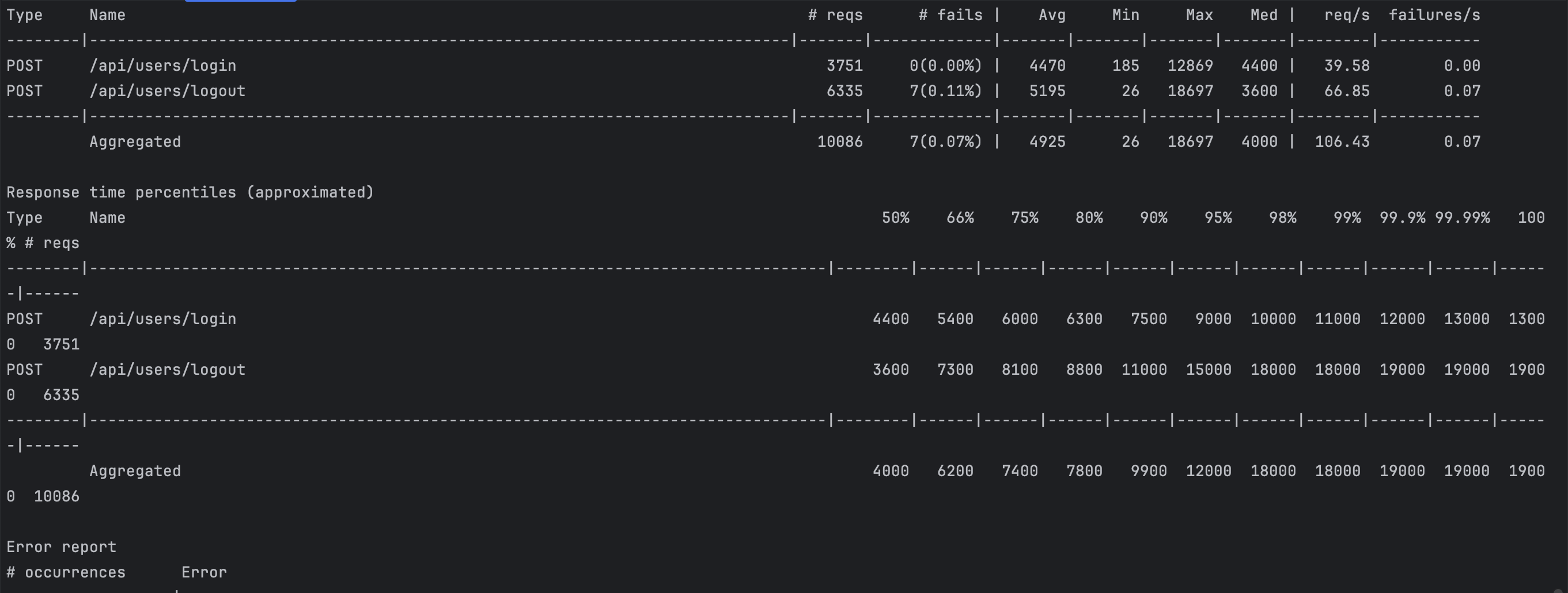 - 테스트 결과, 인증을 전제로 하는 로그아웃을 비롯한 API 호출의 99% 이상 실패 기록