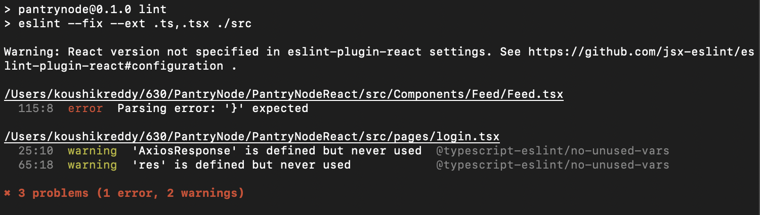 Added ESLint for react frontend. Removed ESLint from root directory as there were plugin issues.