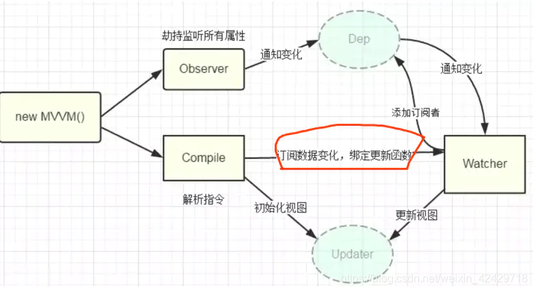 Compile 来解析指令,找到 {{xxx}}、指令、事件、绑定等等,然后再初始化视图。但此时还有一件事情没做,就是当数据发生变化的时候,在更新数据之前,我们还要订阅数据变化,绑定更新函数,此时就需要加入订阅者Watcher了。当订阅者观察到数据变化时,就会触发Updater来更新视图。