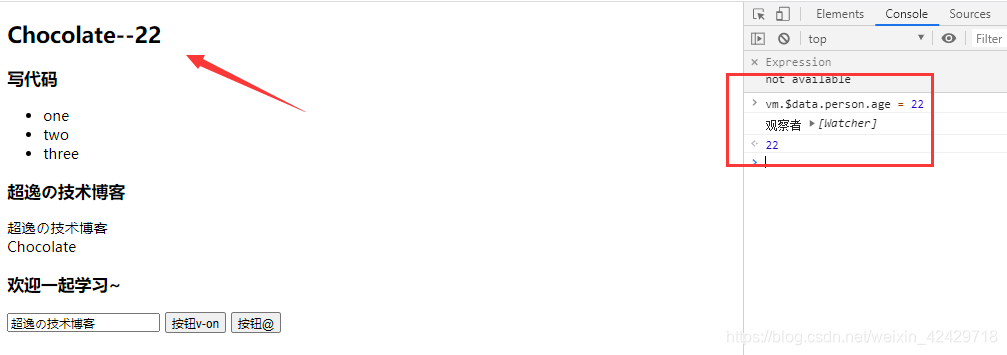 }此时,我们就能通过数据变化来驱动视图了,例如更改我们的年龄 age 从原来的 20 设置为 22,如下图所示,发现数据更改, watcher 去更新了视图。