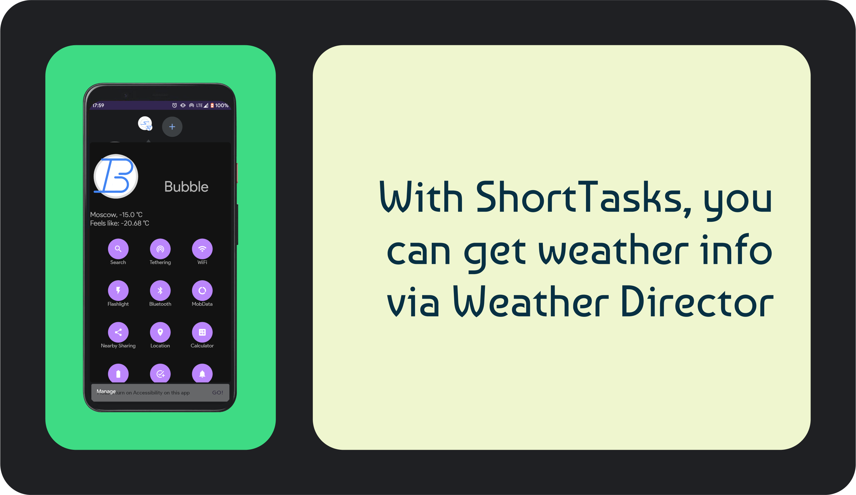 Weather Director is additional feature for Bubble Manager. You can choose city that will show on the top.