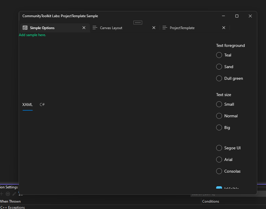 CanvasLayout sample markdown is being pulled. Select the "Canvas Layout" tab, and observe the KeyNotFoundException caused by the sample metadata for CanvasLayout not being present in the solution.