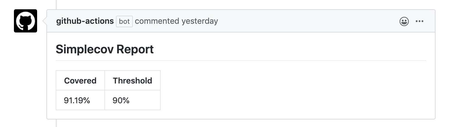 token- The GITHUB_TOKEN secret.failedThreshold- Failed threshold. (default:90)resultPath- Path to last_run json file. (default:coverage/.last_run.json)